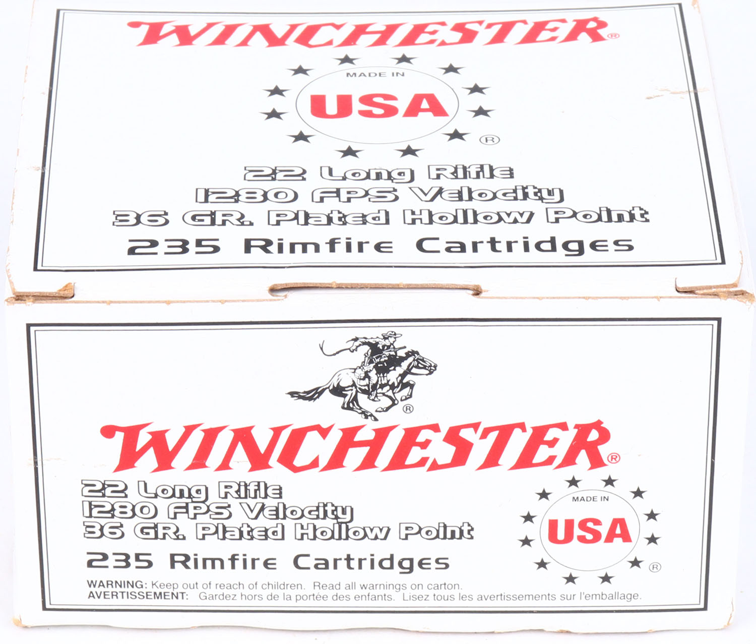 Winchester, .22 Long Rifle, 36 Grain Copper Plated Hollow Point, 1280 FPS, Full, 235 rds. 1pc. white red & black bulk box, box is solid with minty color, very minor shelf wear, corners are sharp, edges are crisp, top flap is solid, ammo is minty. Grade: Excellent ++ - Value: 20 to 40