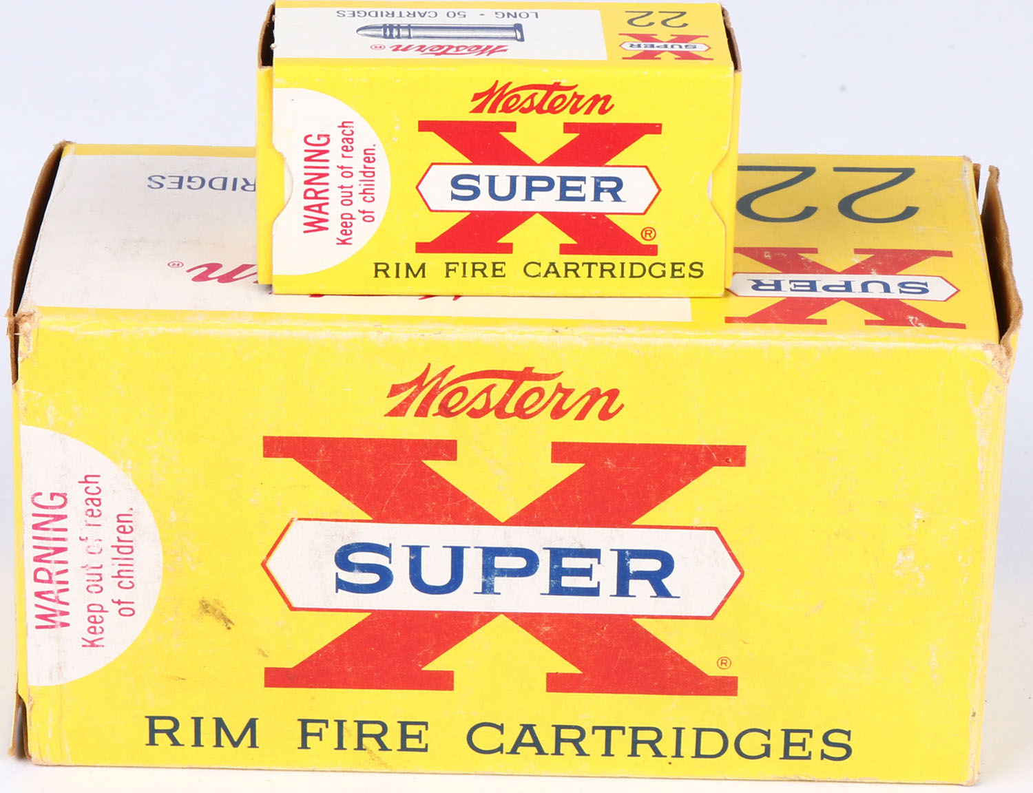 Western, Super X, .22 Long, Full, 500rds. 1pc. Yellow white & red brick, brick is solid with excellent color, very minor age soiling & corner wear, very minor edge wear, end flaps are solid, inside boxes are minty. Grade: Excellent + - Value: 50 to 100