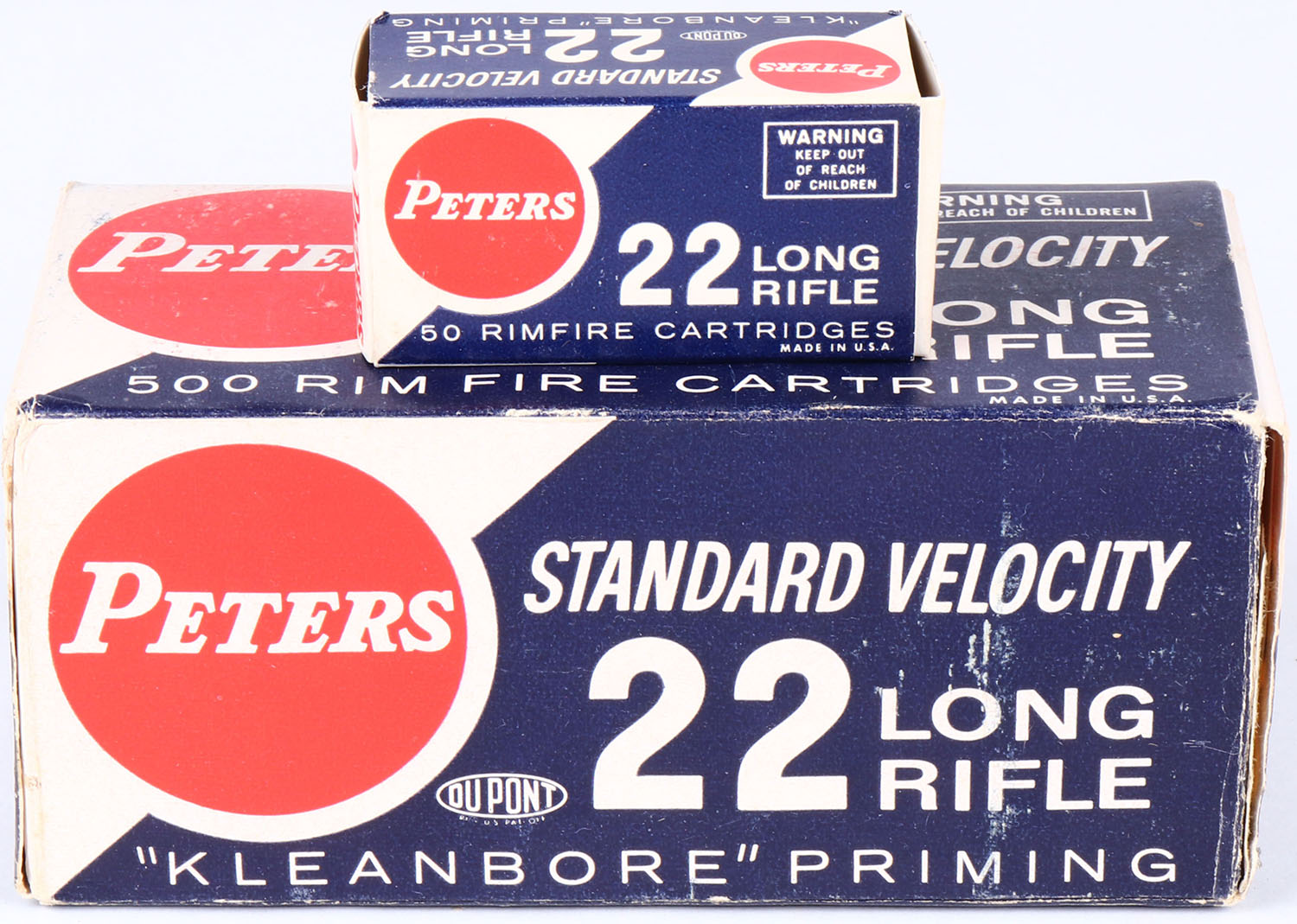 Peters, Standard Velocity, .22 Long Rifle, Full, 500rds. 1pc. blue white & red brick, brick is solid with excellent color, minor age soiling & shelf wear, minor corner wear, very minor edge wear, end flaps are solid, inside boxes are minty. Grade: Excellent + - Value: 50 to 100