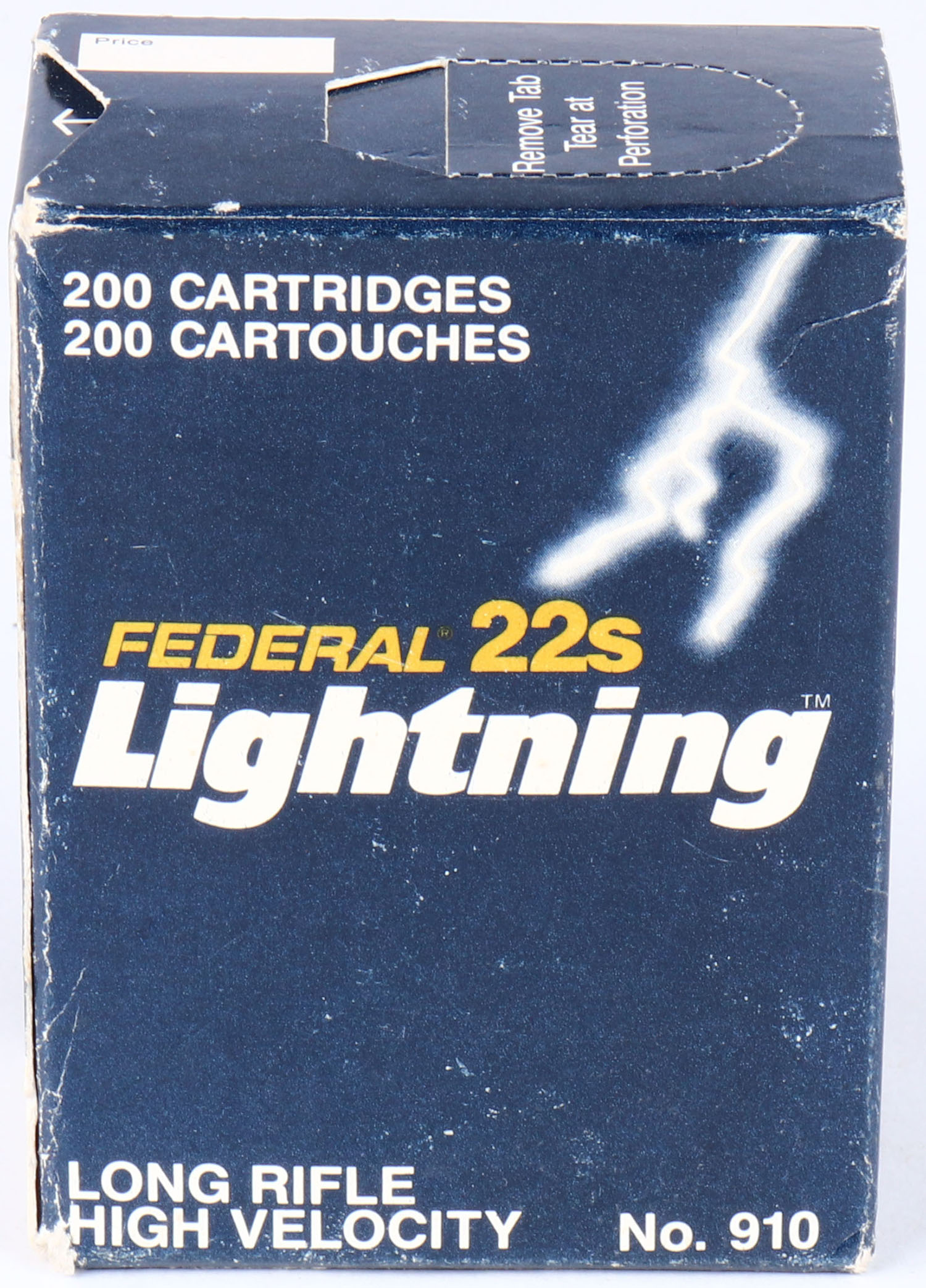 Federal, Lightning, .22 Long Rifle, High Velocity, FULL & SEALED, 200rds. 1pc. blue & white bulk box, box is solid with excellent to minty color, corner wear, some edge & shelf wear, has sticker on bottom. Grade: Excellent + - Value: 10 to 30