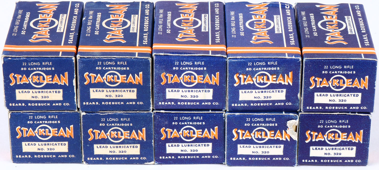 Sears, Sta-Klean, .22 Long Rifle, Lead Lubricated, RHWeb: SEARS-5 LR-1b, lot of (10) Blue orange & white boxes, boxes are minty with minty color, sharp corners, crisp edges, No brick sleeve. Grade: Excellent ++ - Value: 60 to 120
