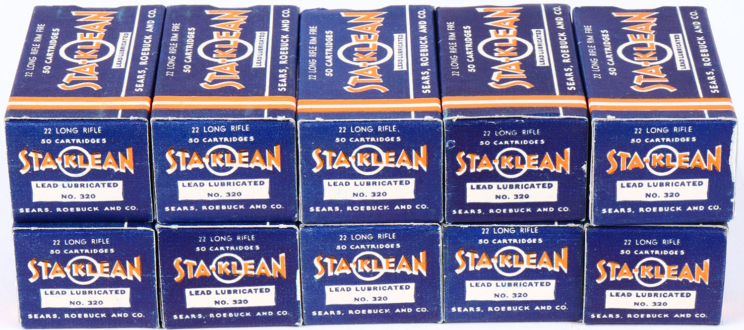 Sears, Sta-Klean, .22 Long Rifle, Lead Lubricated, RHWeb: SEARS-5 LR-1b, lot of (10) Blue orange & white boxes, boxes are minty with minty color, sharp corners, crisp edges, No brick sleeve. Grade: Excellent ++ - Value: 60 to 120