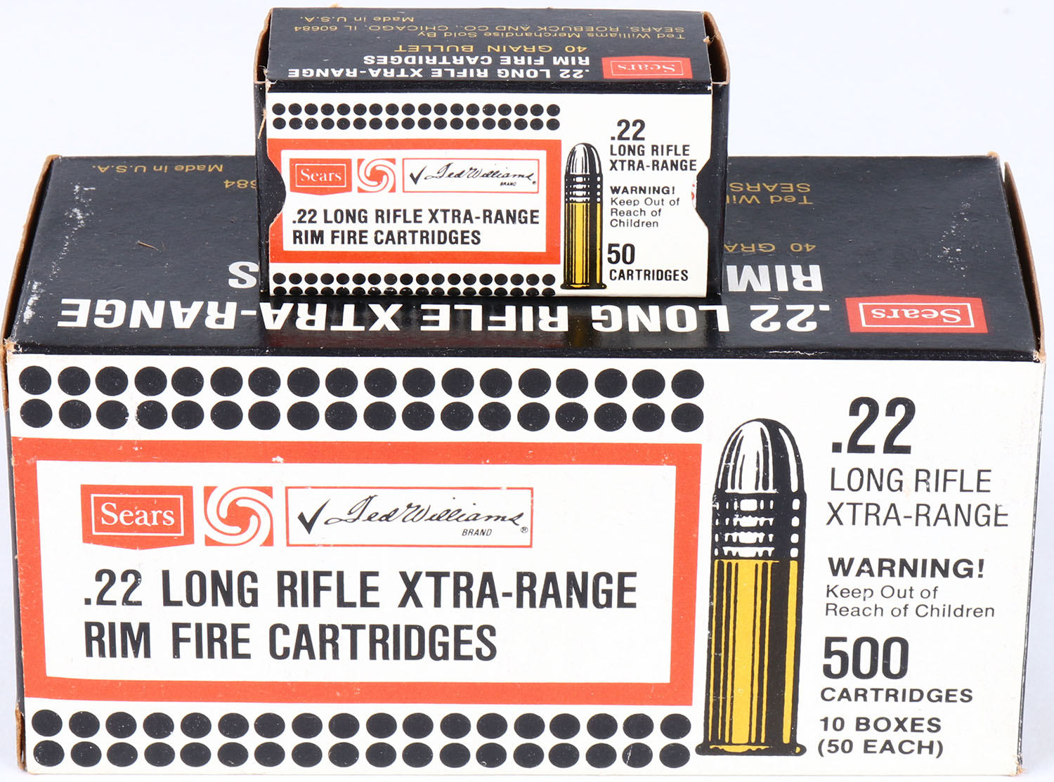 Sears, .22 Long Rifle, Xtra-Range, Full, 500rds. 1pc. Black white & red brick, brick is solid with excellent color, minor shelf & corner wear, edges are mostly crisp, end flaps are solid, inside boxes are minty. Grade: Excellent ++ - Value: 50 to 150