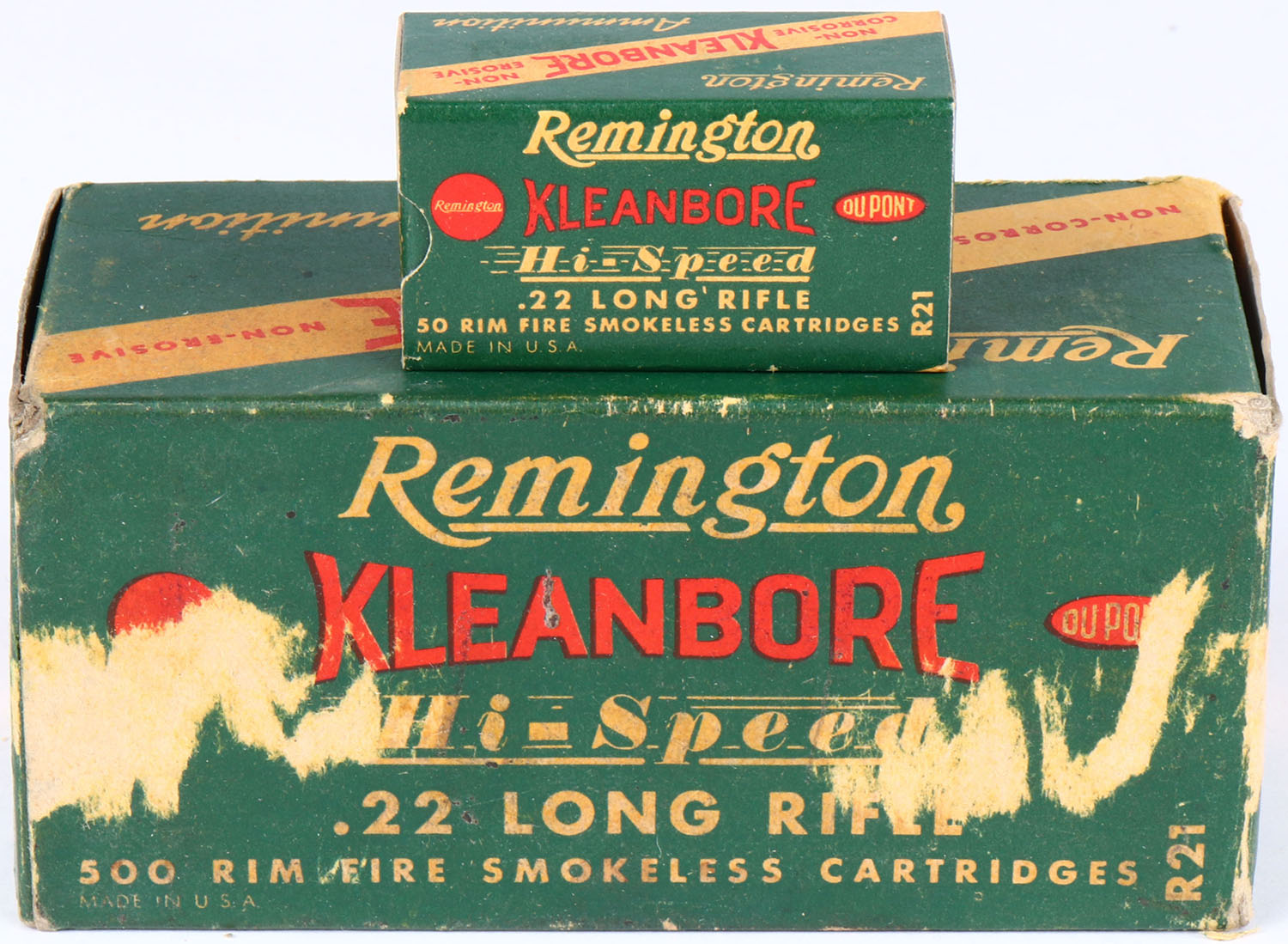 Remington, Kleanbore Hi-Speed, .22 Long Rifle, Partial 9 boxes, 1pc. Green white & red brick, brick is solid with excellent color, age soiling, scuffing, minor corner wear, edges are mostly crisp, end flaps are solid, 8 boxes minty, 1 box excellent. Grade: Very Good ++ - Value: 50 to 150