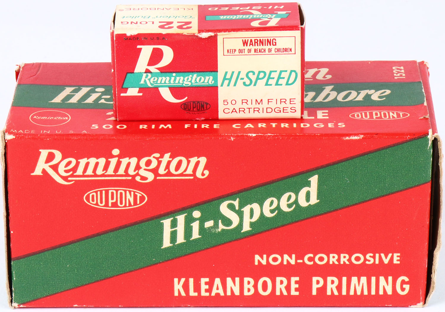 Remington, Hi-Speed Kleanbore, .22 Long Rifle, Partial (7 correct boxes, 3 incorrect) 500rds. 1pc. Red green & white brick, brick is solid with excellent to minty color, some corner wear, very minor edge wear, edges are mostly crisp, end flaps are solid, correct inside boxes are minty. Grade: Excellent + - Value: 40 to 80
