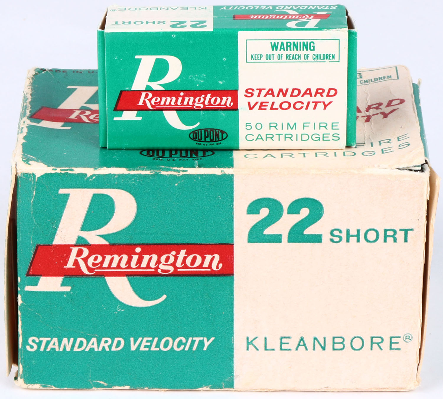 Remington, Standard Velocity, .22 Short, Full, 500rds. 1pc. Green white & red brick, brick is solid with excellent color, some age soiling, edge & corner wear, partial seam split to top front edge, end flaps are solid, inside boxes are minty. Grade: Very Good ++ - Value: 50 to 100