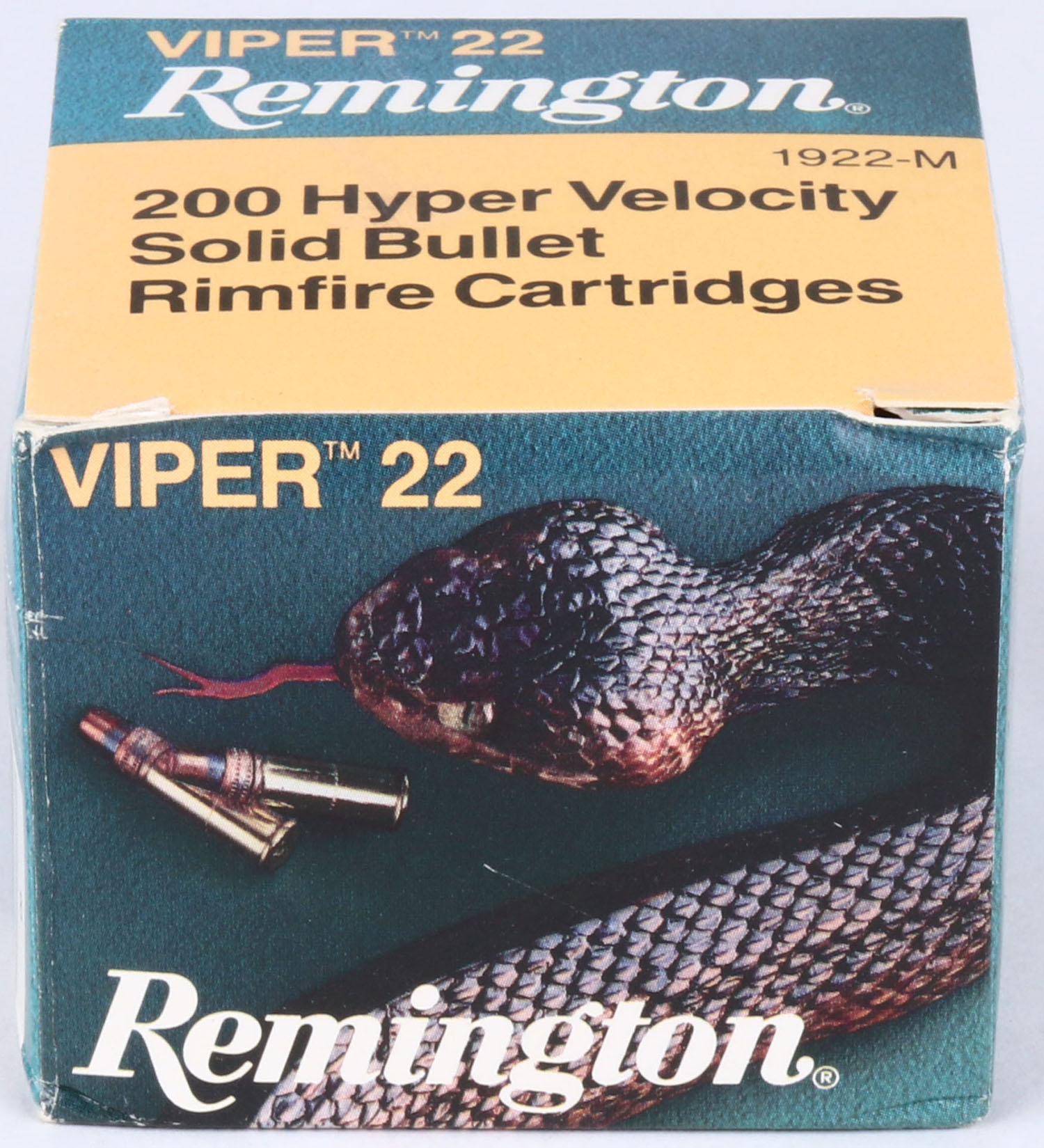 Remington, Viper 22, .22 Long Rifle, Hyper Velocity, Solid Bullet, Full, 200rds. 1pc. Green yellow & white bulk box, box is solid with very good to excellent color, color fading, very minor corner wear, corners are mostly sharp, edges are crisp, top flap is solid, ammo is excellent. Grade: Excellent ++ - Value: 10 to 40