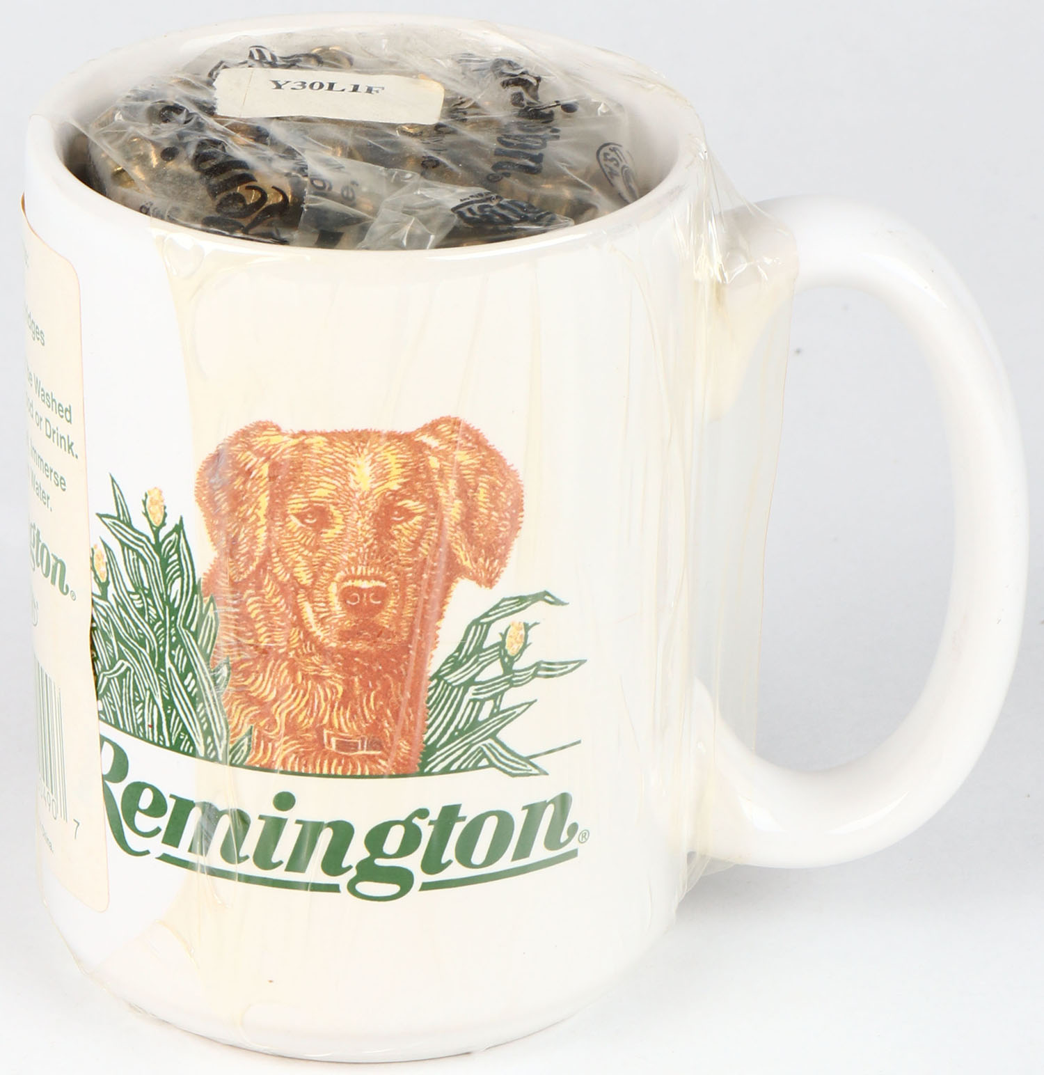 Remington, Hunting Dog Coffee Mug, .22 Long Rifle, FULL & SEALED, 350rds. White mug featuring a Golden Retriever with a send off to Golden Retrievers on the back, mug is near mint with only very minor yellowing to the sealing plastic on the front side, ammo appears mint. Grade: Excellent ++ - Value: 10 to 40