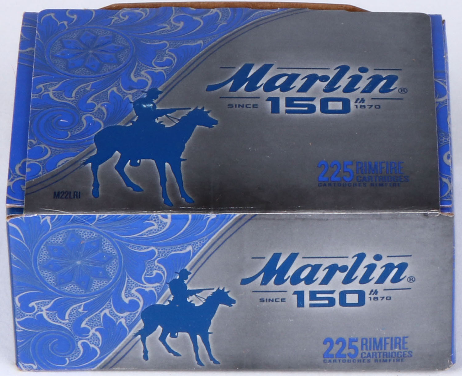 Marlin, 250th Anniversary, .22 Long Rifle Hollow Point, 1280 FPS, Full, 225rds. Silver & blue bulk box, box is MINT with minty color, corners are sharp, edges are crisp, top flap is solid, ammo is mint. Grade: MINT - Value: 100 to 200