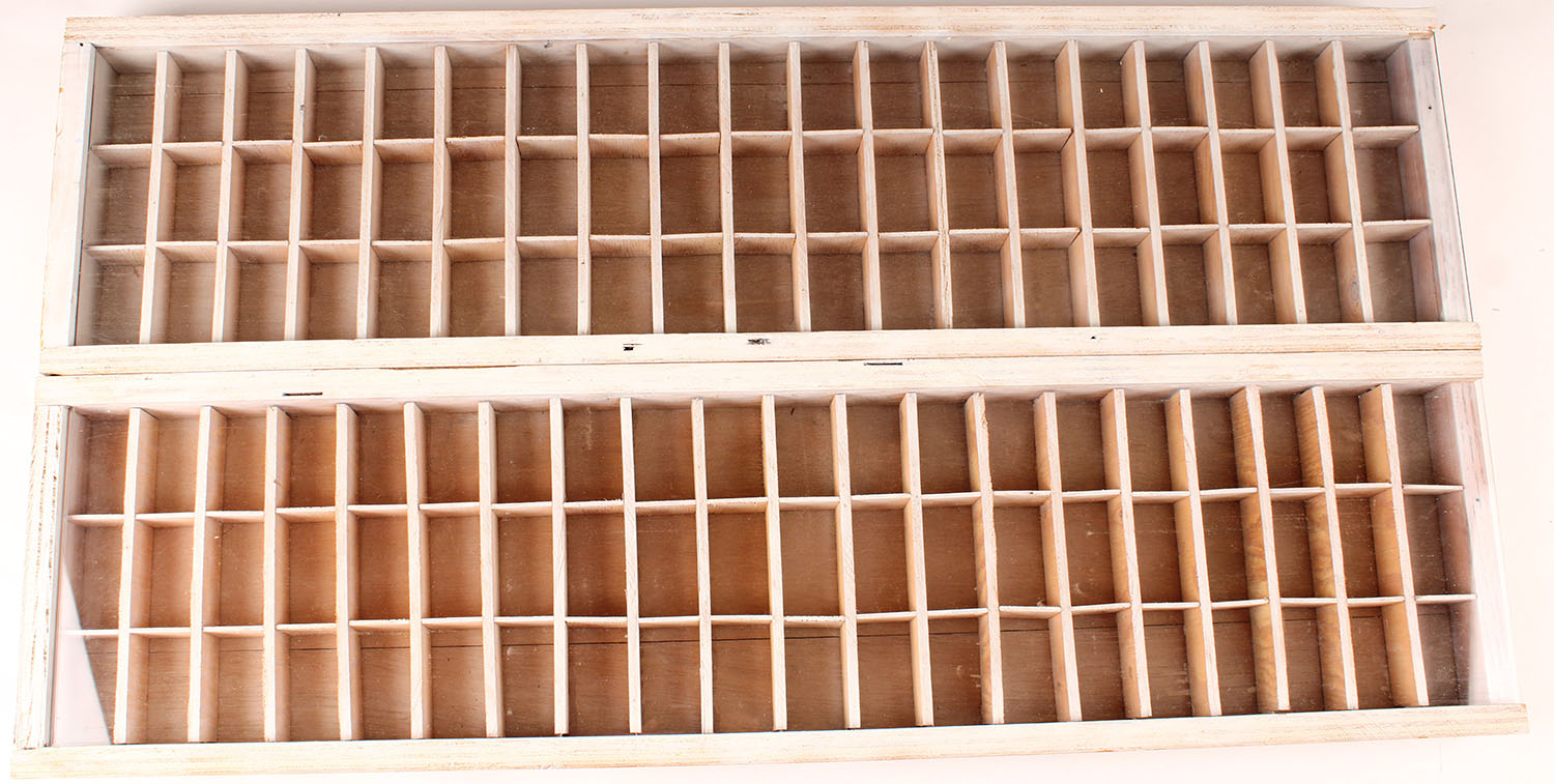 Lot of (2) .22 displays, wood framed and celled with sliding Plexiglas fronts, distressed white painted, (1) measures 36 1/4'' x 9 1/2'' x 2 1/4'' and has 57 cells that would be mounted vertically, (1) measures 36 1/2'' x 9 3/4'' x 2 1/4'' and has 60 cells that would be mounted vertically, distressed white paint, plexiglass cover. Grade: Excellent - Value: 30 to 90
