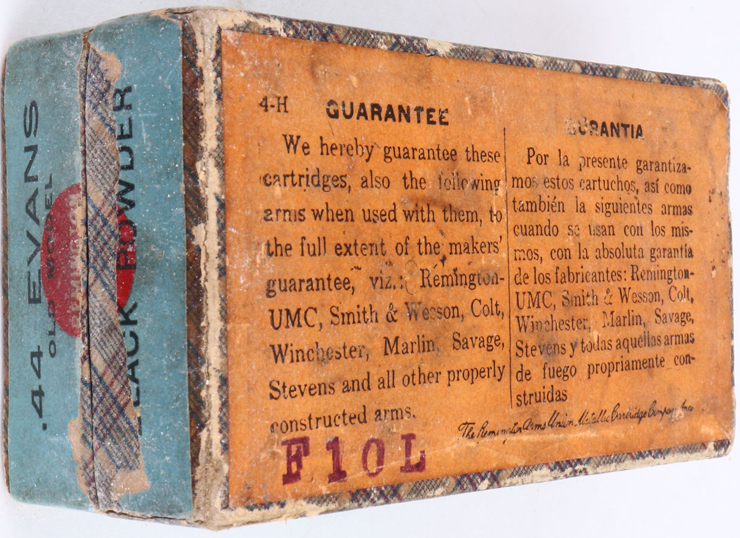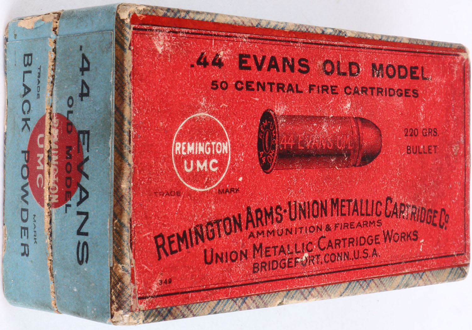 VERY RARE! REM-UMC, .44 Evans Old Model, 220 Grs. Bullet, Specially adapted for .44 Evans Old Model Magazine Rifles, Full, 2pc. Fabric box with red top & blue side sealing labels, box is solid with excellent color, minor age soiling, some shelf wear, minor corner wear, very minor edge wear, labels are 95% intact, ammo is good, FIRST TIME WE HAVE EVER OFFERED THIS ITEM. Grade: Excellent + - Value: 1000 to 5000