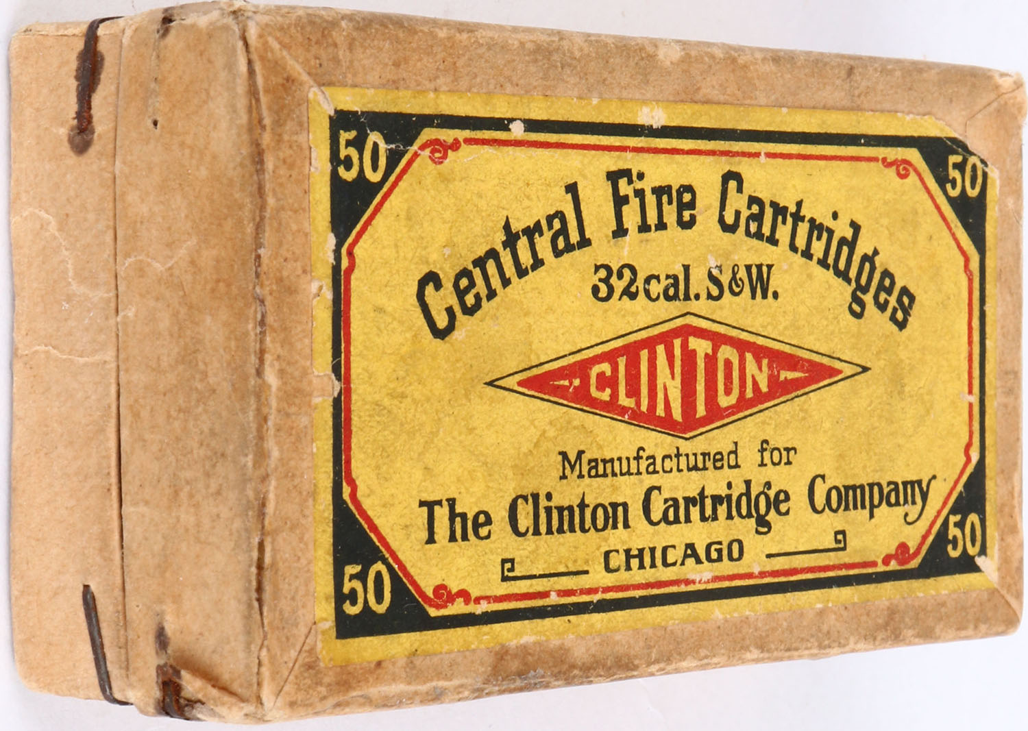 Clinton, Central Fire Cartridges, .32 Cal. S&W, Full, 1pc. Buff box with yellow black & red top label, side sealing label is gone, box is solid with very good to excellent color, some age soiling, seam split to left end of lid has been repaired, minor edge & corner wear, very minor shelf wear, ammo is good to very good. Grade: Very Good ++ - Value: 40 to 80