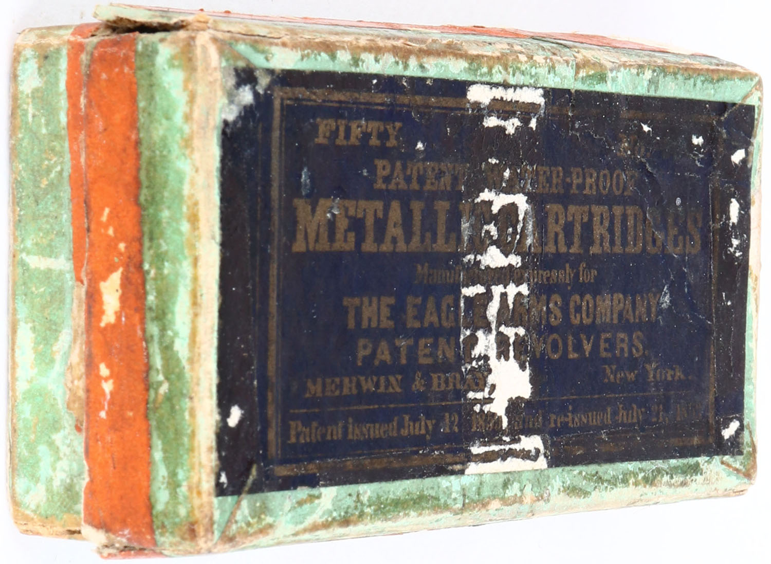 Merwin & Bray, Metallic Cartridges, No. 30, Manufactured Expressly for The Eagle Arms Company Patent Revolvers, Full, 2pc. Green box with black top & orange side sealing labels, Box has very good color, vertical seam splits to all corners of lids, multiple seam splits to lid that have been repaired, tape damage on top, age soiling, edge & corner wear, labels are 90% intact, ammo is good. Grade: Very Good - Value: 200 to 800