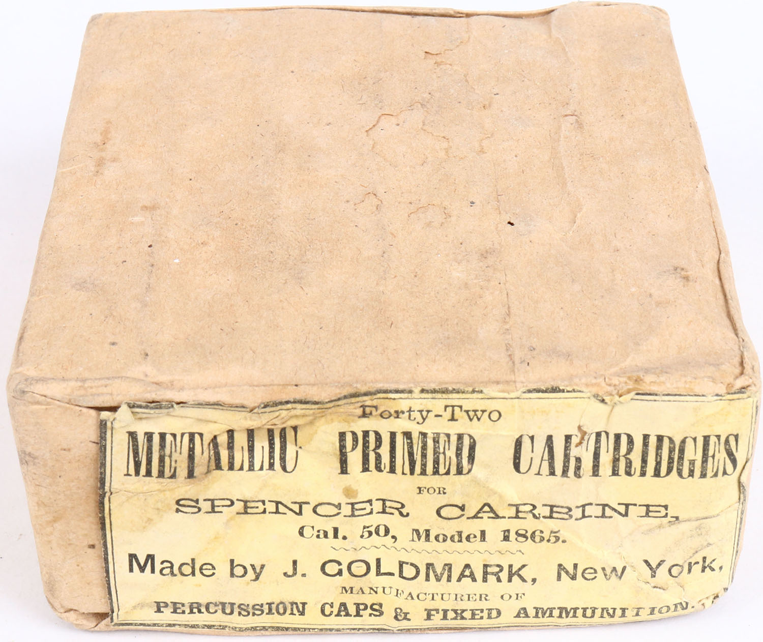 J. Goldmark, Metallic Primed Cartridges for Spencer Carbine, .50 Cal. Model 1865, FULL & SEALED, Buff paper package with yellow top label, package and label are solid with excellent color, some age soiling, label is wrinkled and lightly stained. Grade: Excellent + - Value: 200 to 600