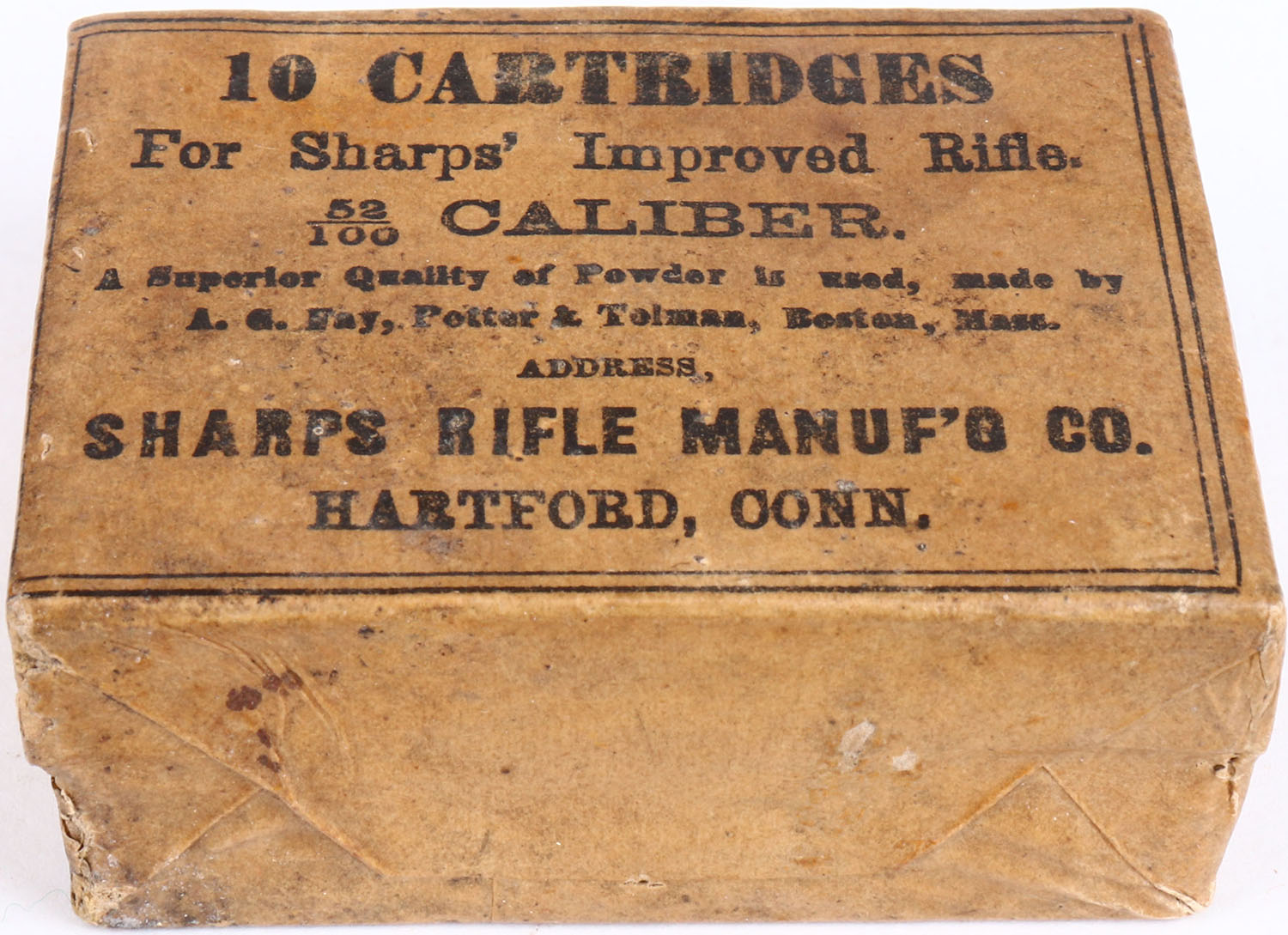 Sharps Rifle Manuf'g Co., 52/100 Caliber, For Sharps' Improved Rifle, FULL & SEALED 2pc. Box wrapped in a buff & black paper package, box is solid with very good color, age soiling, minor chipping & tearing to outer packaging, very minor corner wear, edges are mostly crisp, outer packaging is 99% intact. Grade: Excellent + - Value: 300 to 900