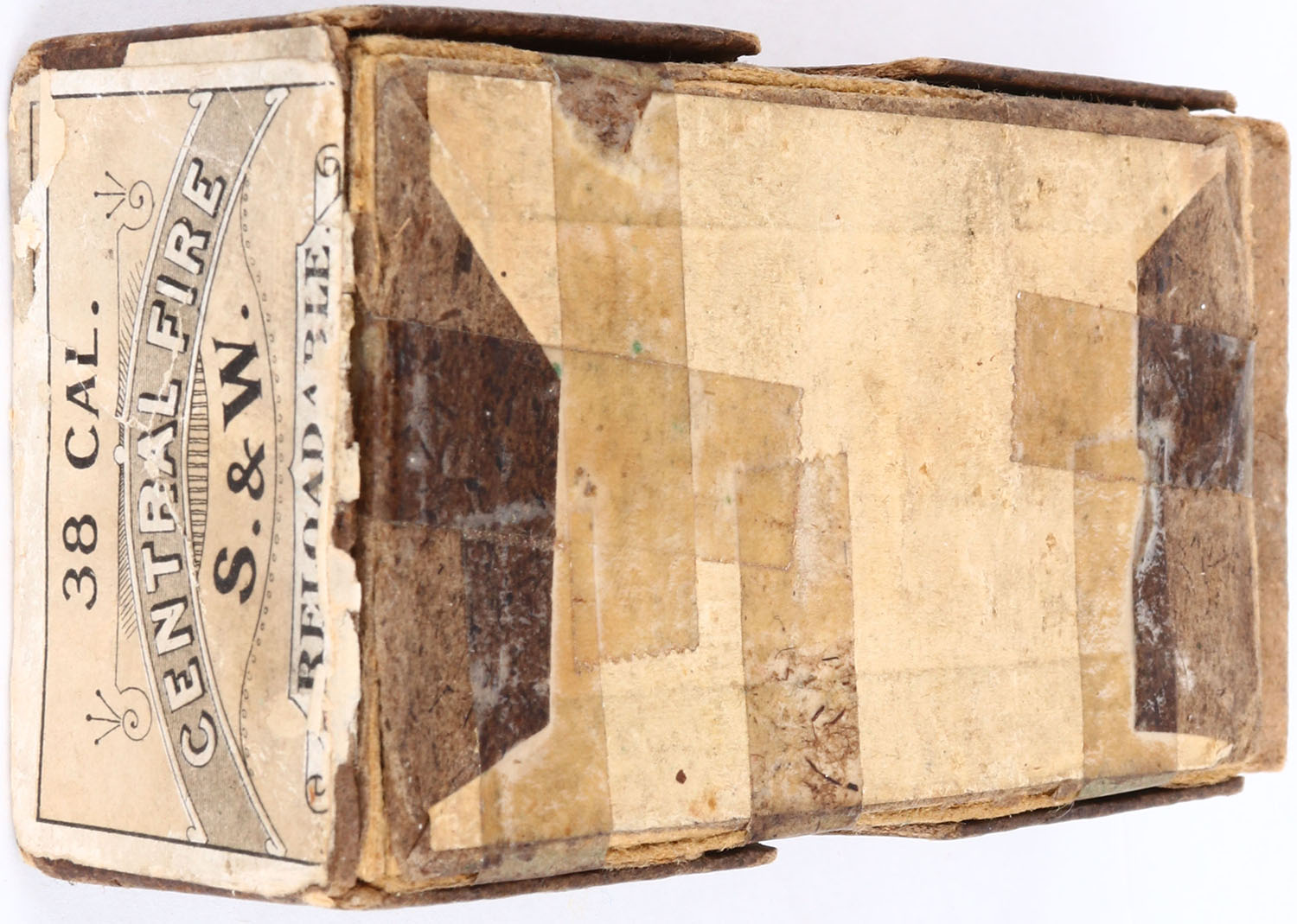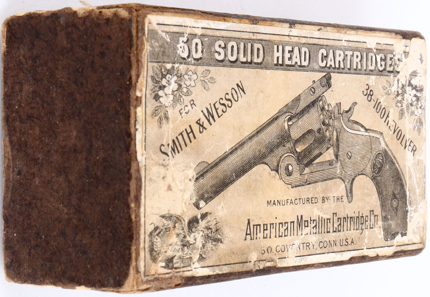 American Metallic, .38 S&W, Shot Cartridges, Partial 45rds., 2pc. Brown box with gray & black labels, labels remain on top & right end, has excellent color, scuffing, minor age soiling, some edge & corner wear, 2 seam splits on lid, ammo is very good to excellent. (384) Grade: Excellent - Value: 50 to 200