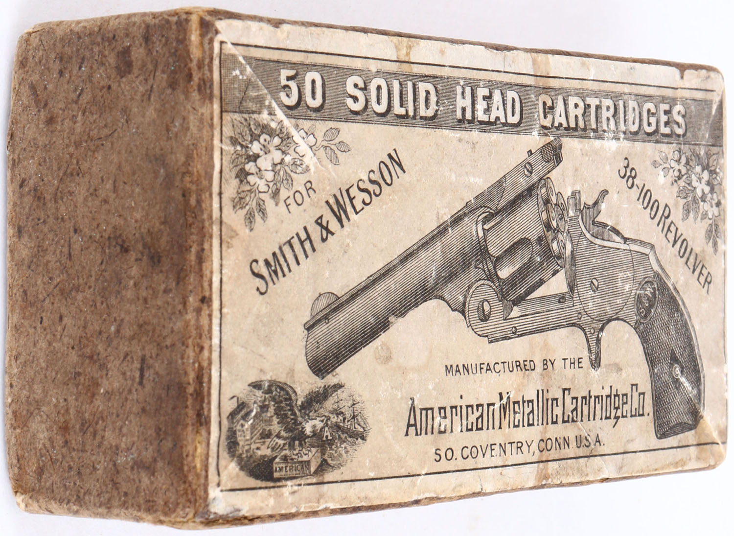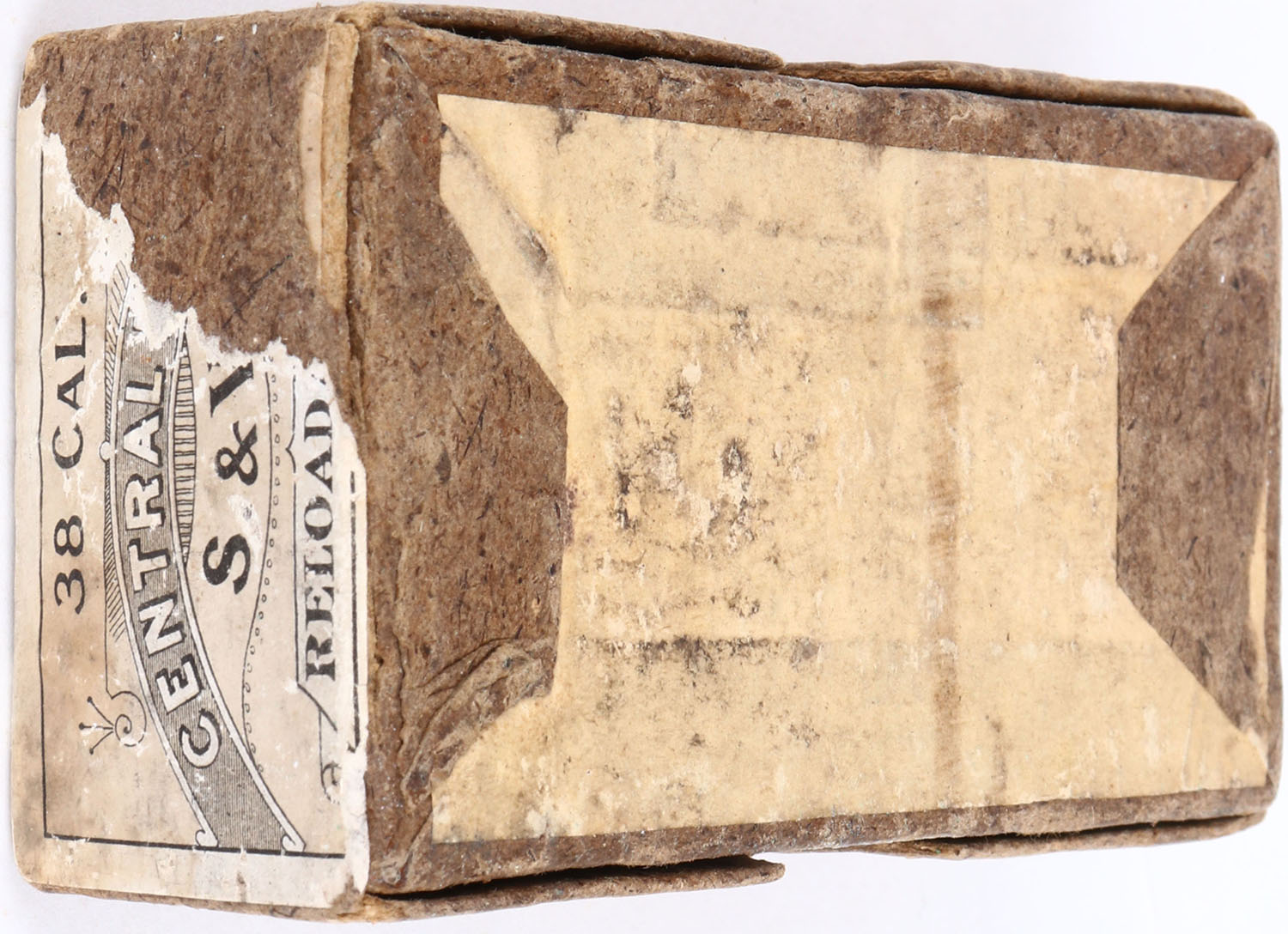 American Metallic, .38 S&W, Solid Head, Partial 42rds., 2pc. Brown box with gray & white label, box is solid with very good color, age soiling, some shelf & corner wear, label on right end is partially torn, very minor edge wear, label is 95% intact, ammo is good to very good. Grade: Very Good ++ - Value: 50 to 200