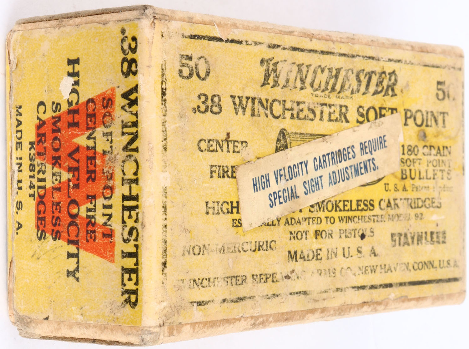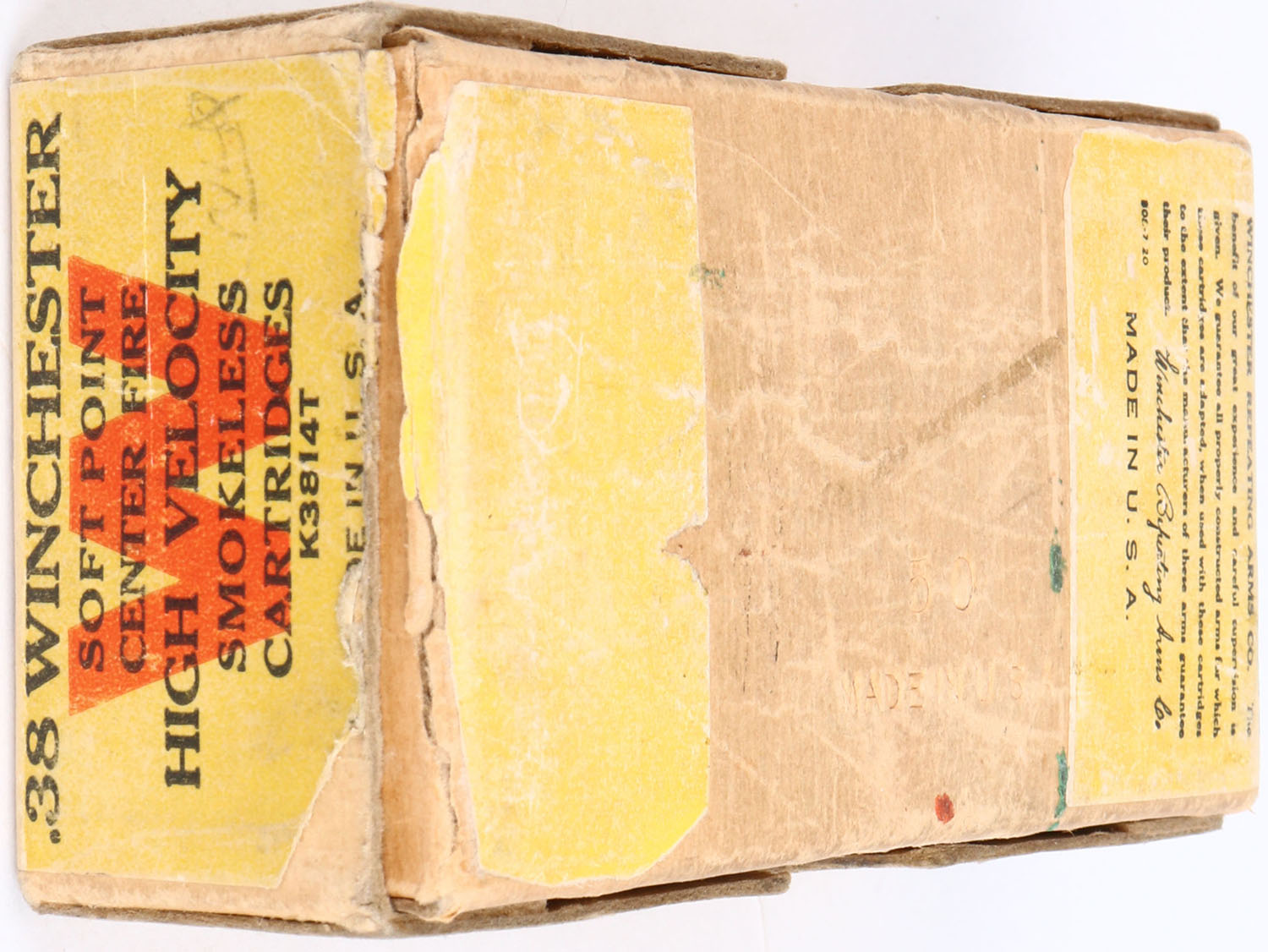 Winchester, .38 Winchester Soft Point, 180 Grain Soft Point Bullets, High Velocity Over-Label, Partial 46rds., 2pc. Buff box with yellow wraparound label, box is solid with good color, color fading to top, shelf wear, edge & corner wear, front has been written on, labels and over-label are intact, ammo is excellent. Grade: Very Good ++ - Value: 80 to 250