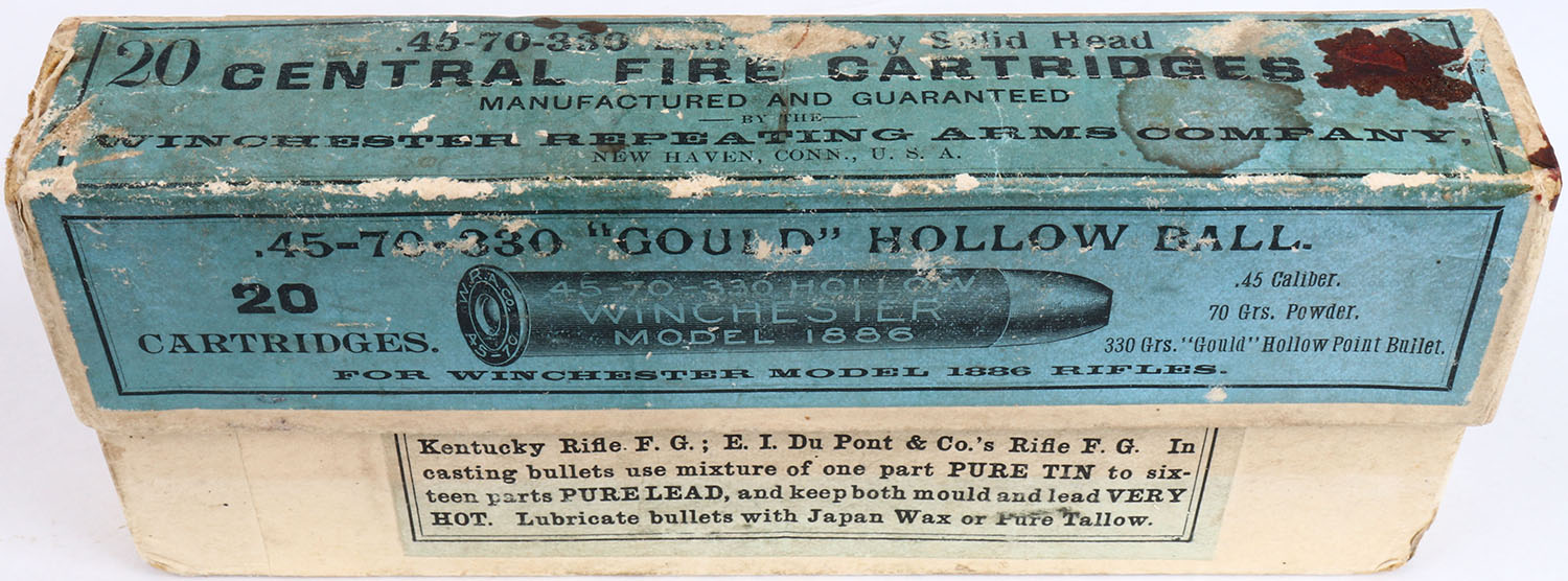 Winchester, .45-70-330 ''Gould'' Hollow Ball, Model 1886, Partial 5rds., 2pc. Buff box with blue label, box is solid with very good color, minor age soiling, staining to top, shelf wear, some edge & corner wear, labels are intact, ammo is excellent. Grade: Very Good ++ - Value: 100 to 300