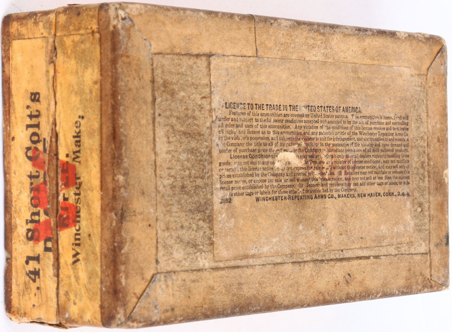 Winchester, Colt's, .41 Short Colt, Full, 2pc. Buff box with blue top & yellow side sealing labels, box is solid with good color, age soiling, shelf wear, side sealing label is sealed on back side, some edge & corner wear, side sealing label is 90% intact, ammo is very good to excellent. Grade: Very Good ++ - Value: 100 to 500