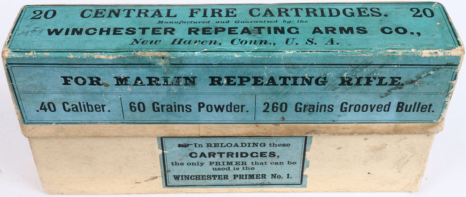 Winchester, .40-60, 260 Grains Grooved Bullet, For Marlin Repeating Rifle, Full, 2pc. Buff box with blue labels, box is solid with excellent color, very minor age soiling, minor edge & corner wear, bottom has been written on, labels are intact, ammo is excellent. Grade: Excellent + - Value: 100 to 300