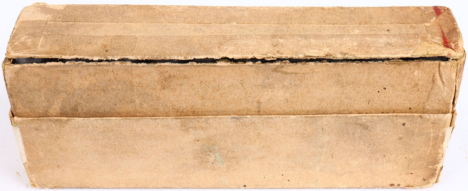Winchester, .50-95 Winchester Express, Partial 16rds., 2pc. Buff box with green label, box is solid with excellent color, very minor age soiling, edge & corner wear, partial seam split on bottom left end, ammo is excellent. Grade: Excellent - Value: 100 to 500