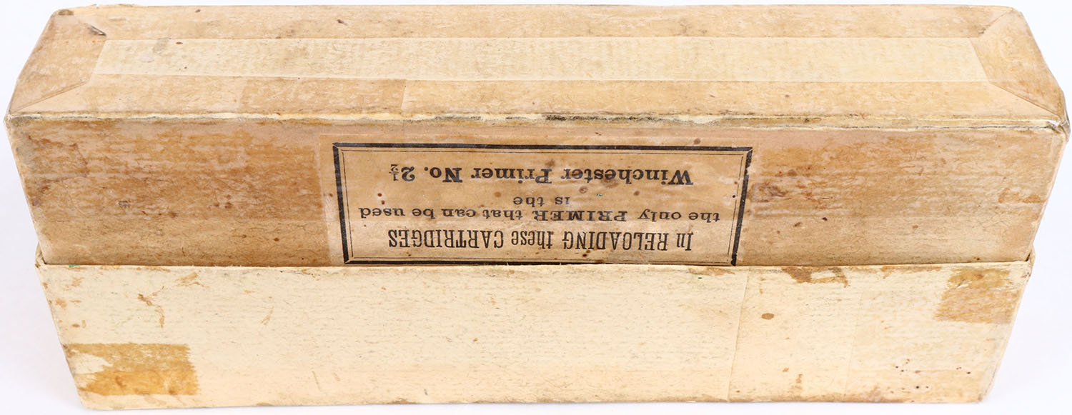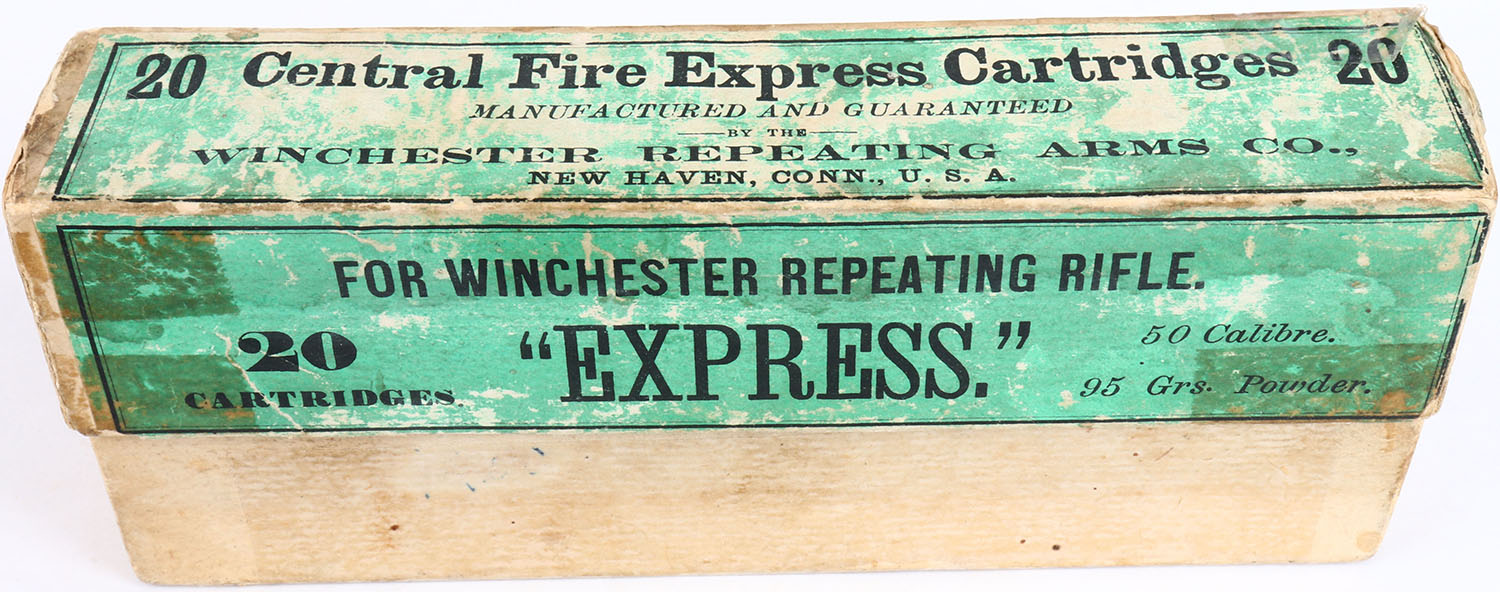 Winchester, ''Express'', .50-95, Full, 2pc. Buff box with green label, box is solid with very good to excellent color, some age soiling, box has tape in many places, vertical seam splits to 3 corners of lid have been repaired, shelf wear, some edge & corner wear, label is intact, ammo is excellent. Grade: Very Good ++ - Value: 200 to 600