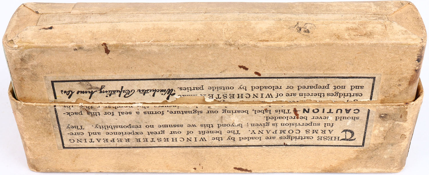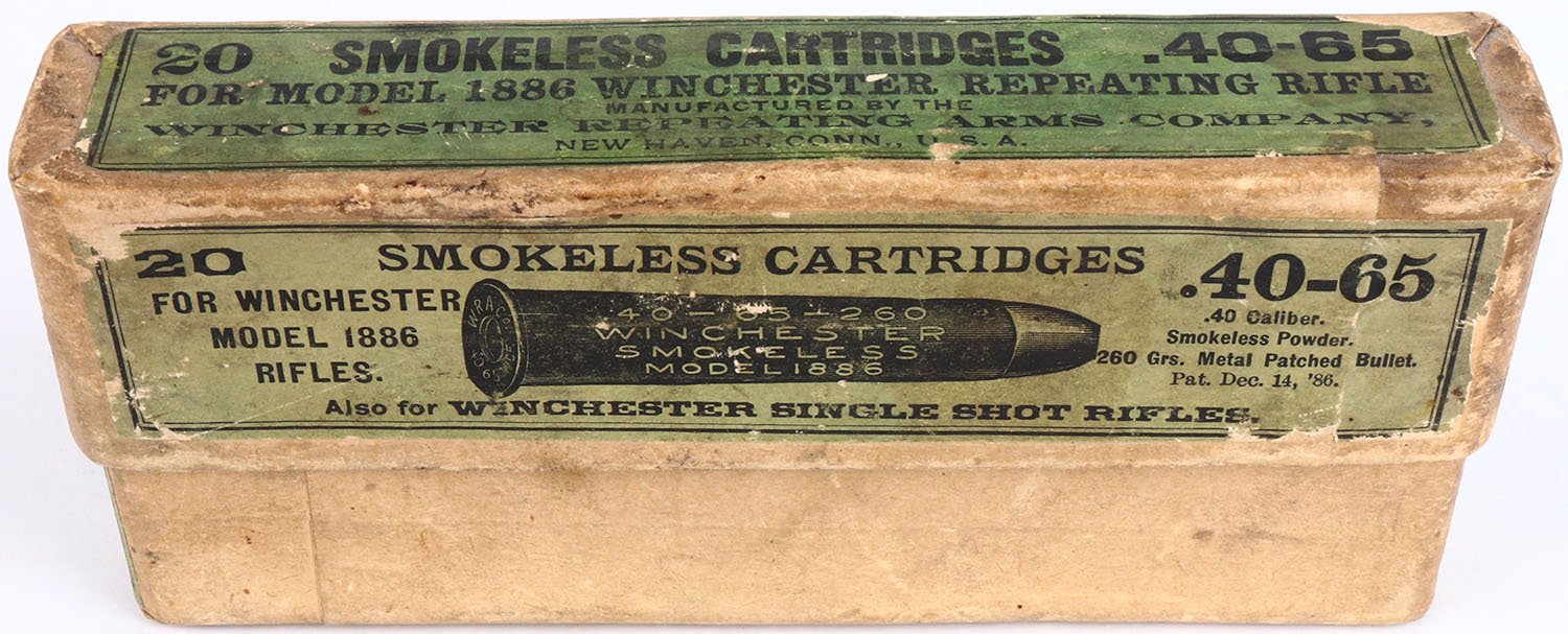 Winchester, .40-65-260, Model 1886, Partial 16rds., 2pc. Buff box with green labels, box is solid with very good color, age soiling, some shelf wear, minor edge & corner wear, labels are intact, ammo is excellent. Grade: Excellent - Value: 50 to 150