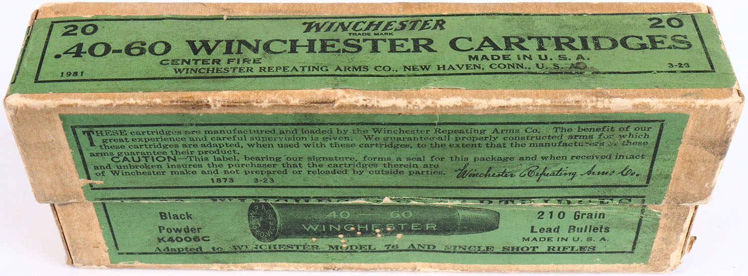 Winchester, .40-60-210, Black Powder, Model 76 and Single Shot Rifles, Full, 2pc. Buff box with green labels, box is solid with excellent color, some age soiling, minor edge & corner wear, some shelf wear, labels are intact, ammo is excellent. Grade: Excellent + - Value: 50 to 150