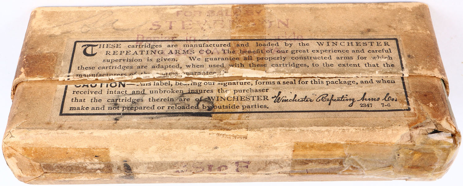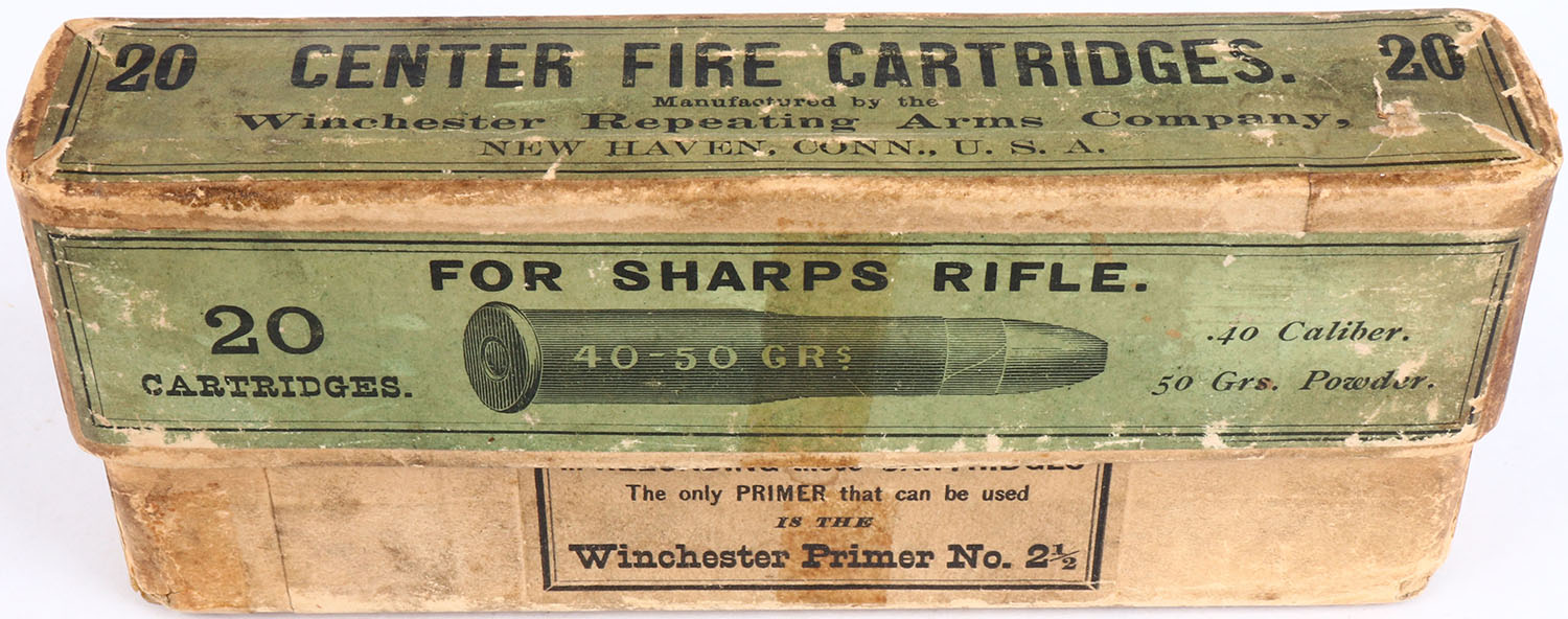 Winchester, .40-50, For Sharps Rifle, Full, 2pc. Buff box with green labels, box is solid with very good color, age soiling, shelf wear, some edge & corner wear, tape on bottom, vertical tape stains along the middle of box, labels are intact, ammo is excellent. Grade: Excellent - Value: 100 to 300