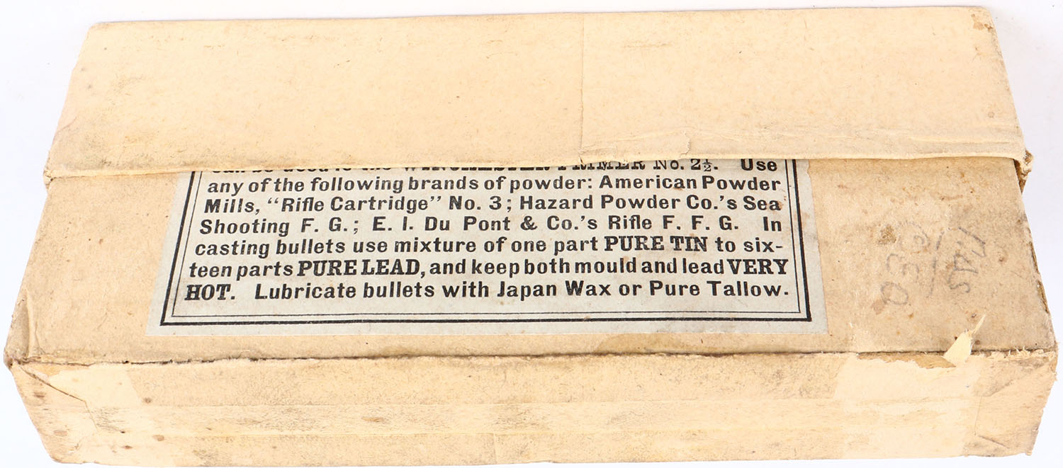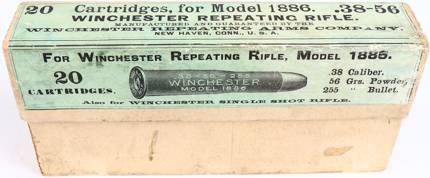 RARE! Winchester, .38-56-255, Model 1886 & Single Shot Rifles, Full, 2pc. Buff box with green label, box is solid with excellent color, minor age soiling, some edge & corner wear, back and right end have been written on, some staining to the front, labels are intact, ammo is excellent. Grade: Excellent + - Value: 100 to 500