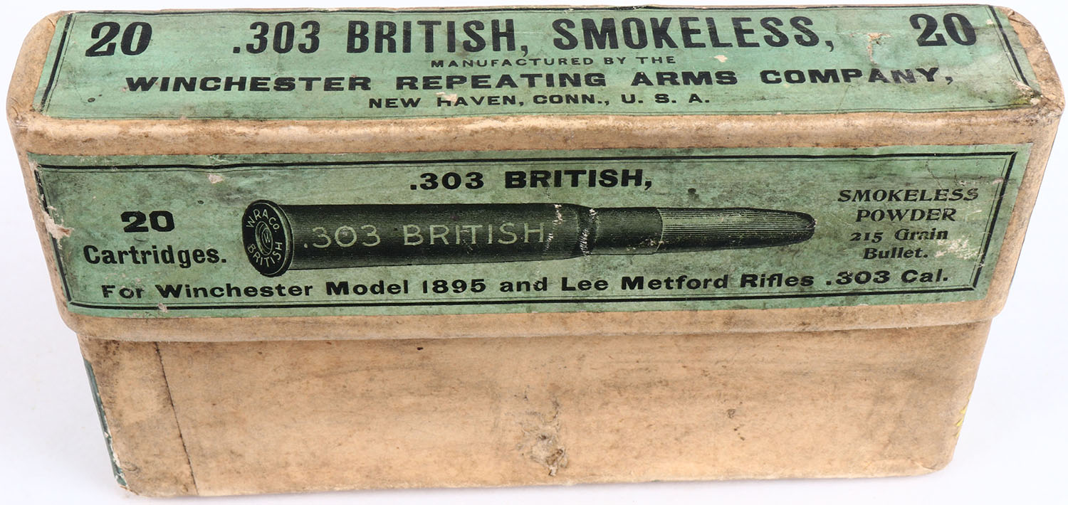 Winchester, .303 British, Smokeless Powder, Model 1895 and Lee Metford Rifles, Full, 2pc. Buff box with green labels, box is solid with very good color, age soiling, very minor shelf & edge wear, minor corner wear, labels are intact, most ammo has cracked necks but is otherwise excellent. Grade: Excellent - Value: 50 to 200