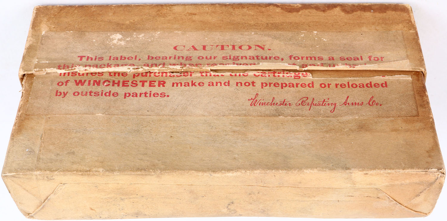 Winchester, .30 Winchester (.30-30), Model 1894, Smokeless Powder, 160 Grains Metal Patched Bullet, Full, 2pc. Buff box with green label, box is solid with very good color, age soiling, some shelf & edge wear, minor corner wear, labels are intact, ammo is very good to excellent. Grade: Excellent - Value: 200 to 400