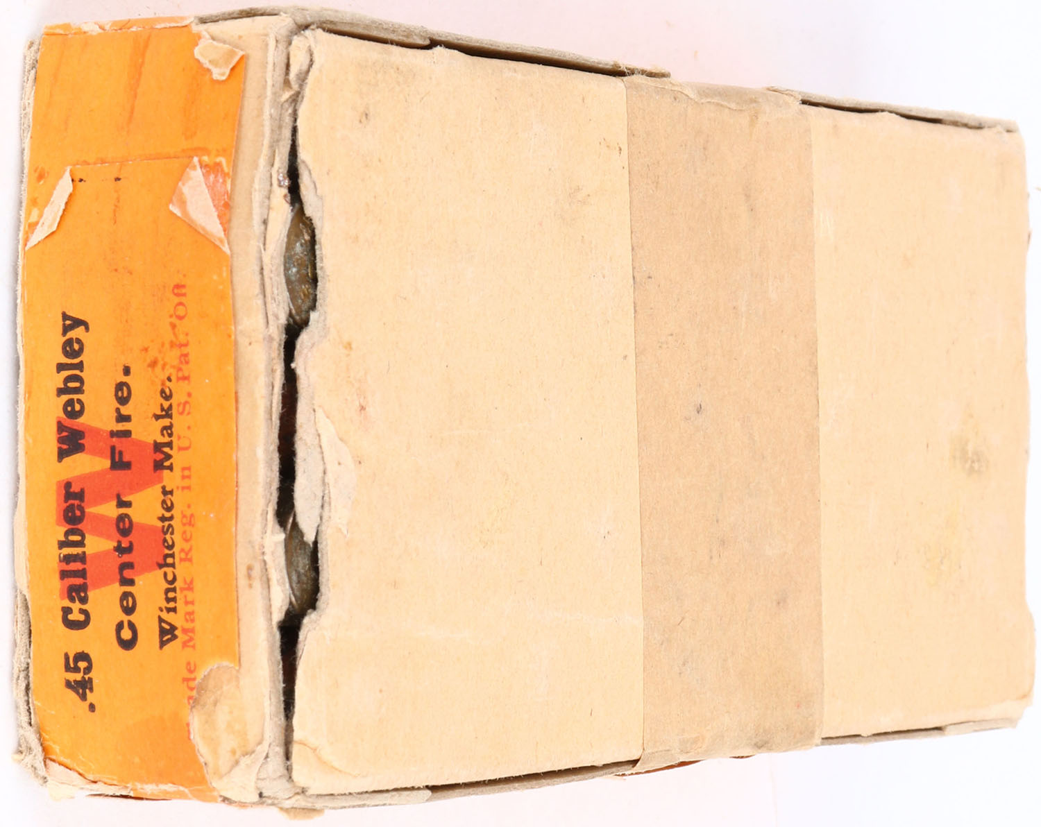 Winchester, .45 Webley, Webley Double Action Pistol, 20 Grs. Powder, 230 Grs. Lead Bullet, FULL & SEALED, 2pc. Buff box with green top & orange side sealing labels, box is solid with excellent color, very minor shelf wear & staining to the front, very minor edge & corner wear, partial seam splits to both top and bottom edge of right end, labels are intact. Grade: Excellent + - Value: 150 to 300