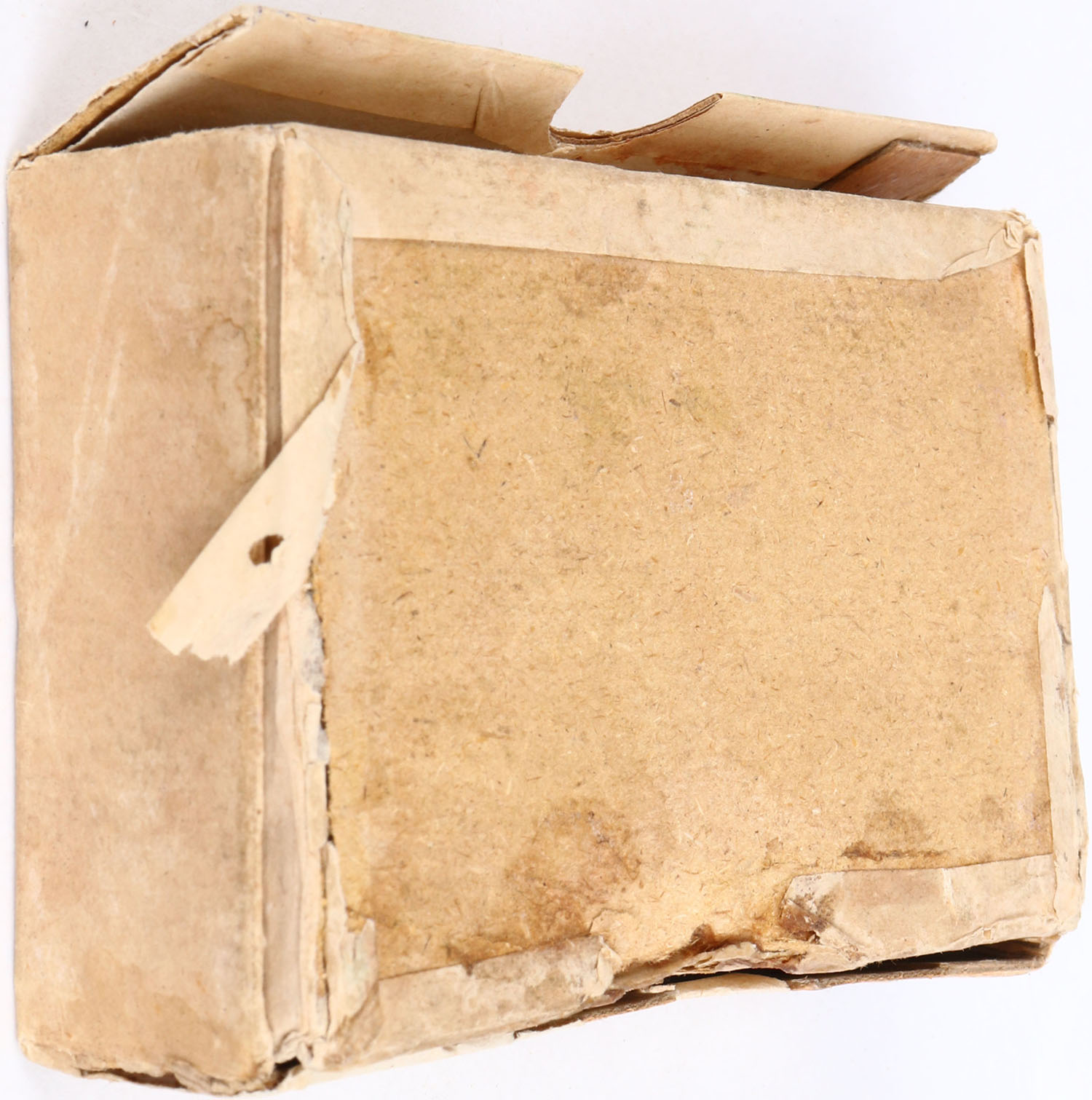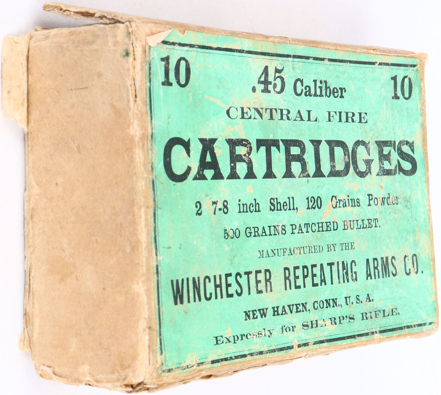 Winchester, .45 Caliber, 2 7-8 inch Shell, 120 Grains Powder, 500 Grains Patched Bullet, Full, 2pc. Buff box with green top label, box is solid with excellent color, minor age soiling, shelf wear, 2 vertical seam splits to the back side of lid, scuffing to front, edge & corner wear, partial seam split to bottom front edge, top label is intact, ammo is excellent. Grade: Very Good + - Value: 50 to 150