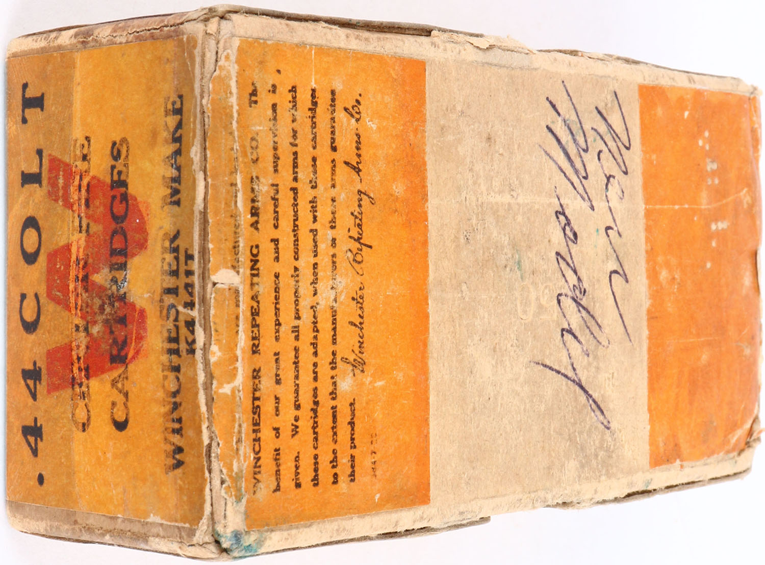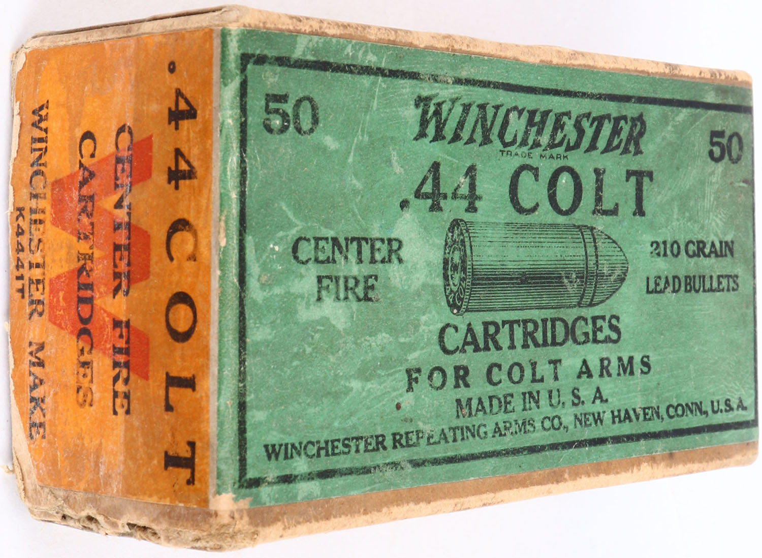 Winchester, .44 Colt, 210 Grain Lead Bullets, Full, 2pc. Buff box with green & orange wraparound label, box is solid with very good color, some age soiling, vertical seam split to front left corner of lid, tape stains all the way around lid, back side and bottom have been written on, some edge & corner wear, label is intact, ammo is very good. Grade: Very Good ++ - Value: 50 to 150