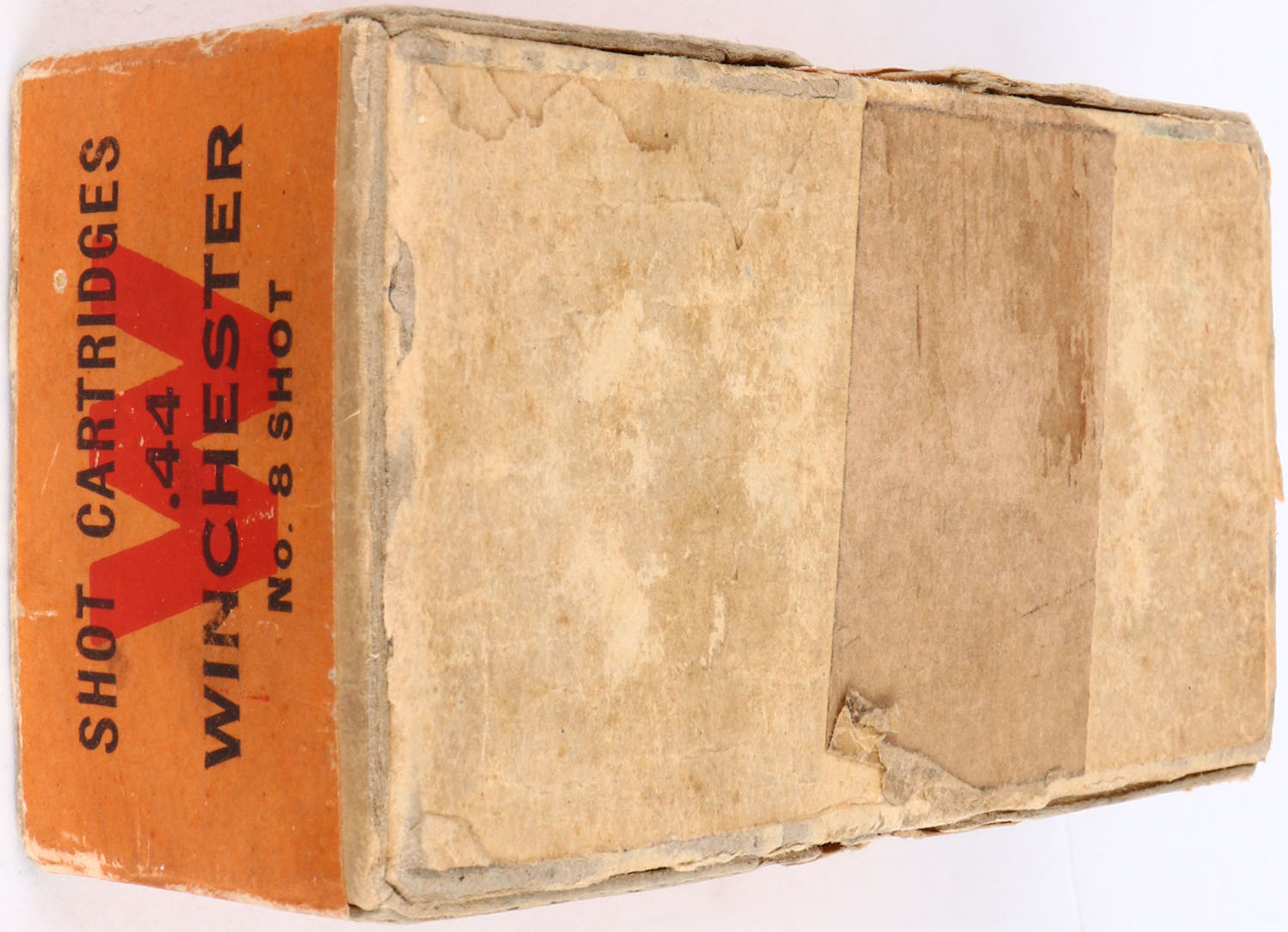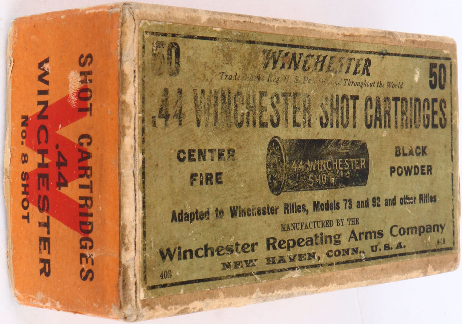 Winchester, .44 Winchester Shot Cartridges, Black Powder, Full, 2pc. Buff box with green top & orange side sealing labels, box is solid with good to very good color, some age soiling & color fading on top, partial seam split to right end of lid, some corner & edge wear, shelf wear, labels are intact, ammo is very good to excellent. Grade: Very Good ++ - Value: 50 to 150