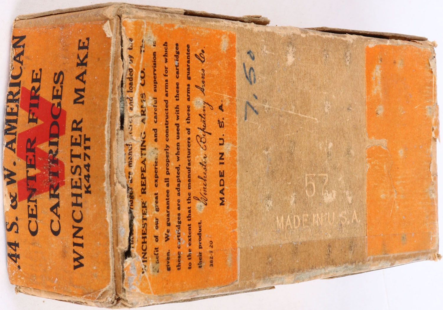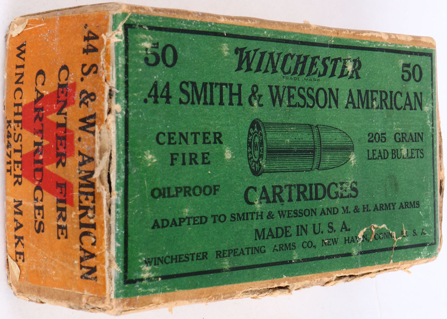 Winchester, .44 Smith & Wesson American, 205 Grain Lead Bullets, Oilproof, Full, 2pc. Buff box with green & orange wraparound label, box is solid with excellent color, minor age soiling, several partial seam splits on lid, bottom edges are all split and held together with tape, edge wear, corner wear, some shelf wear, bottom has been written on, label is intact, ammo is good to very good. Grade: Very Good - Value: 30 to 90