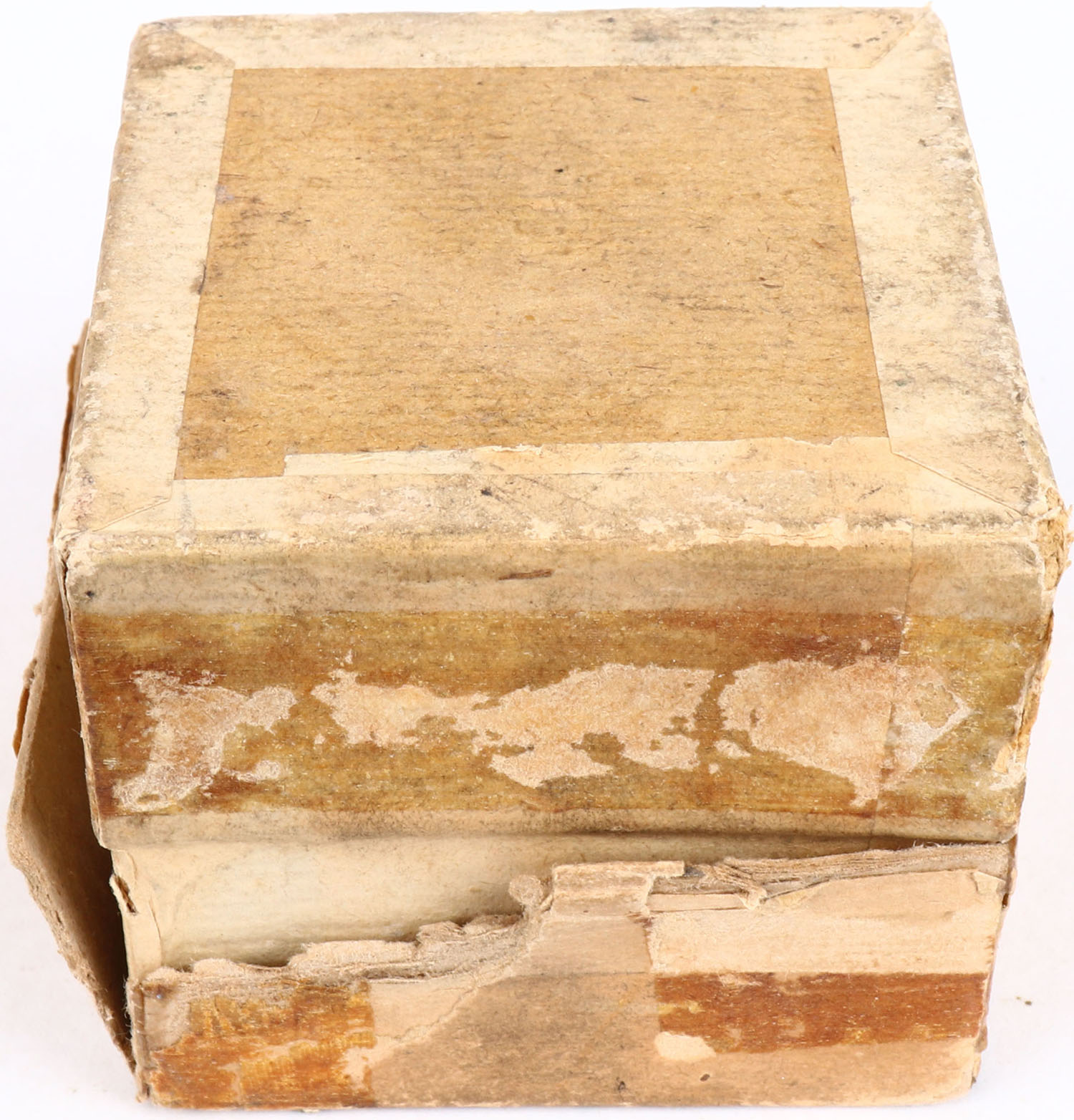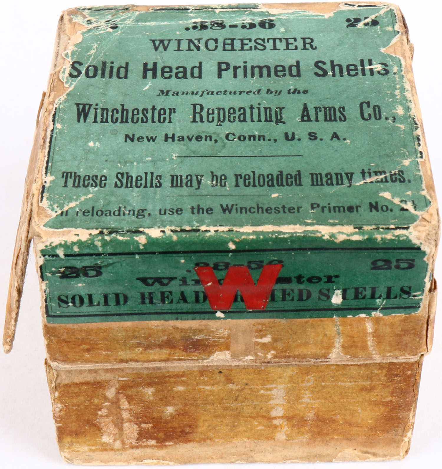 Winchester, .38-56, Solid Head Primed Shells, Partial 24rds., 2pc. Buff box with green top label, side sealing label is gone, vertical seam splits to both corners of left end of lid, very good to excellent color, minor age soiling, shelf wear, some edge & corner wear, ammo is excellent. Grade: Very Good + - Value: 10 to 50