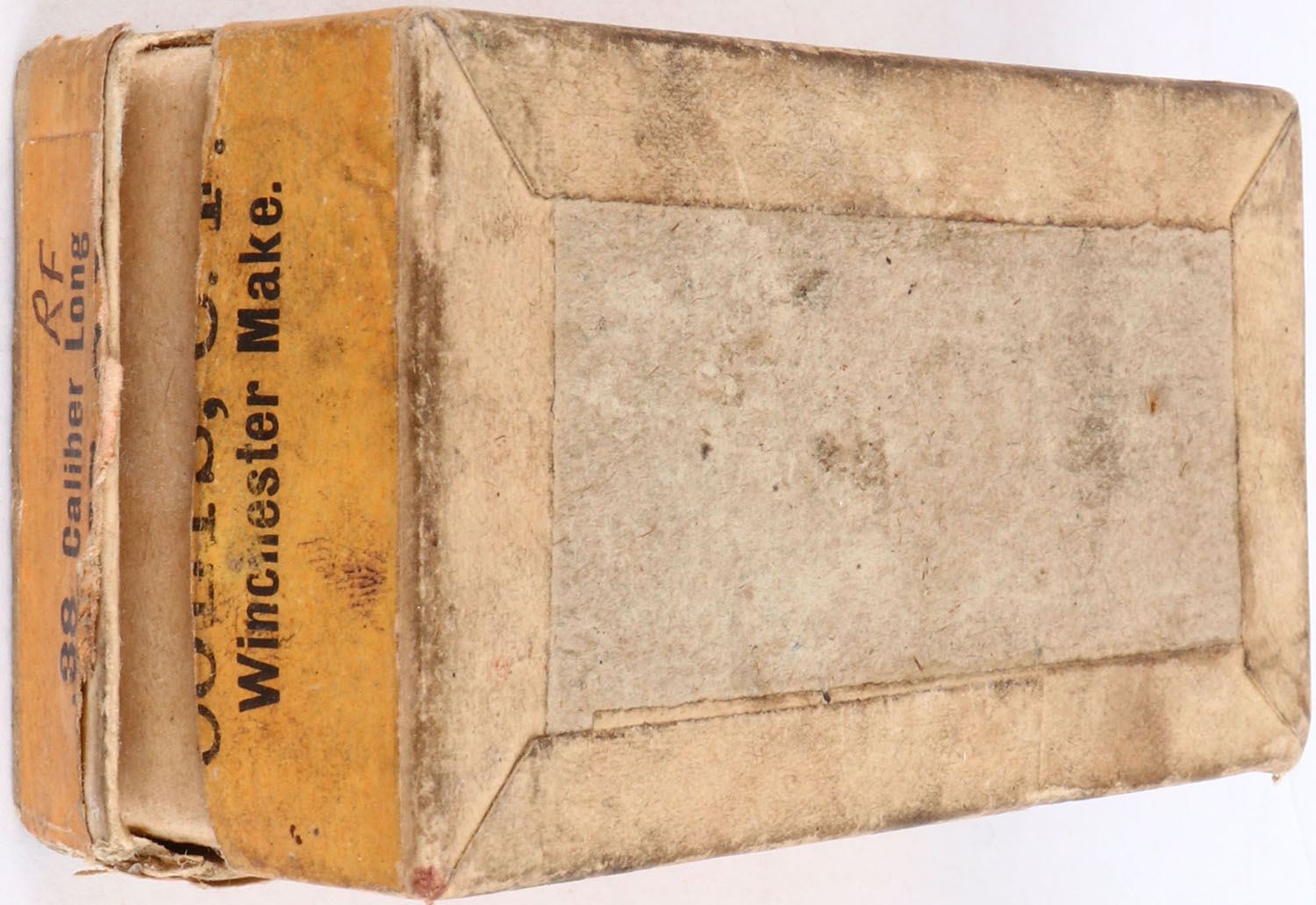 Winchester, .38 Long Colt, Colt's Double Action, Single Action, And Other .38 Caliber Pistols, Full, 2pc. Buff box with green top & orange side sealing labels, box is solid with very good color, some age soiling, vertical seam splits to both corners on right end of lid, minor edge & corner wear, left end has been written on, labels are intact, ammo is good. Grade: Excellent - Value: 50 to 150