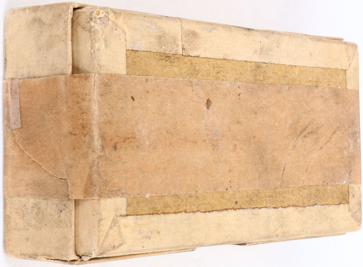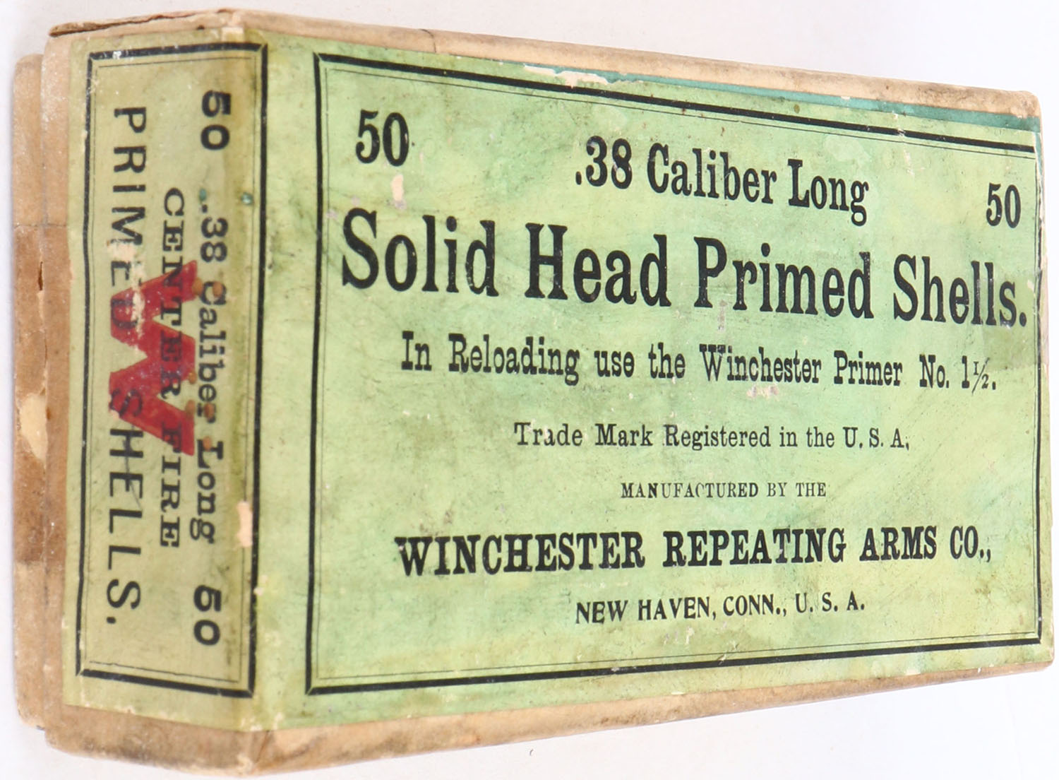 Winchester, .38 Caliber Long, Solid Head Primed Shells, Full, 2pc. Buff box with green & buff wraparound label, box is solid with excellent color, some age soiling & staining, very minor shelf wear, corners are mostly sharp, edges are crisp, labels are intact, ammo is excellent. Grade: Excellent + - Value: 20 to 60