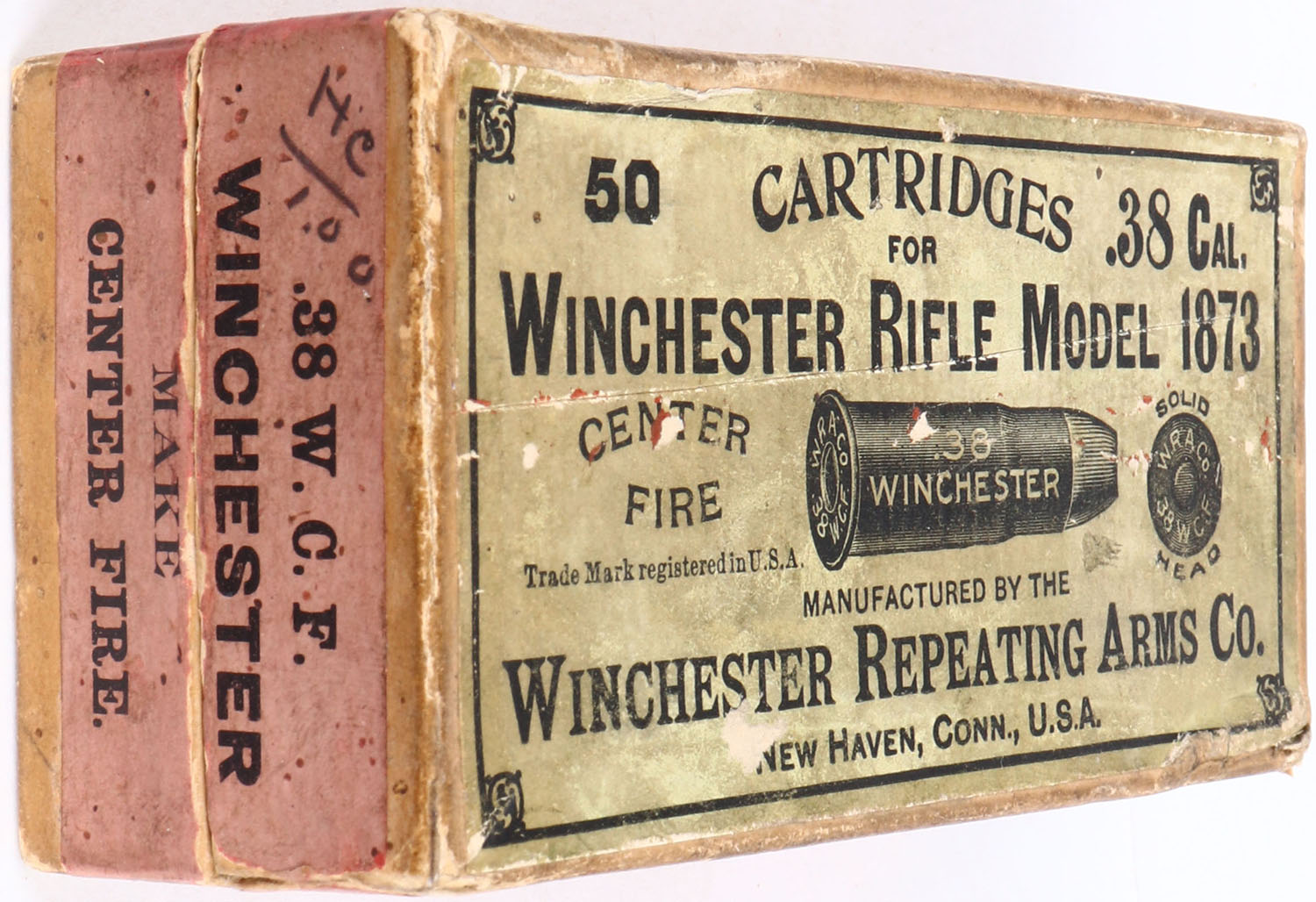 Winchester, .38 Cal., Model 1873, Solid Head, Full, 2pc. Buff box with green top & red side sealing labels, box is solid with very good color, some age soiling & color fading, some shelf & corner wear, edges are mostly crisp, left end has been written on, labels are intact, ammo is very good to excellent. Grade: Excellent - Value: 150 to 300