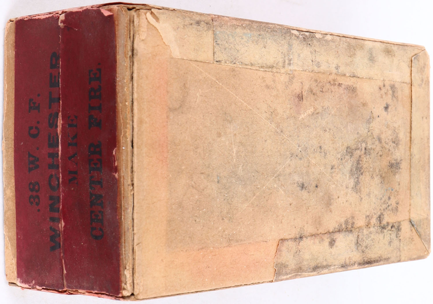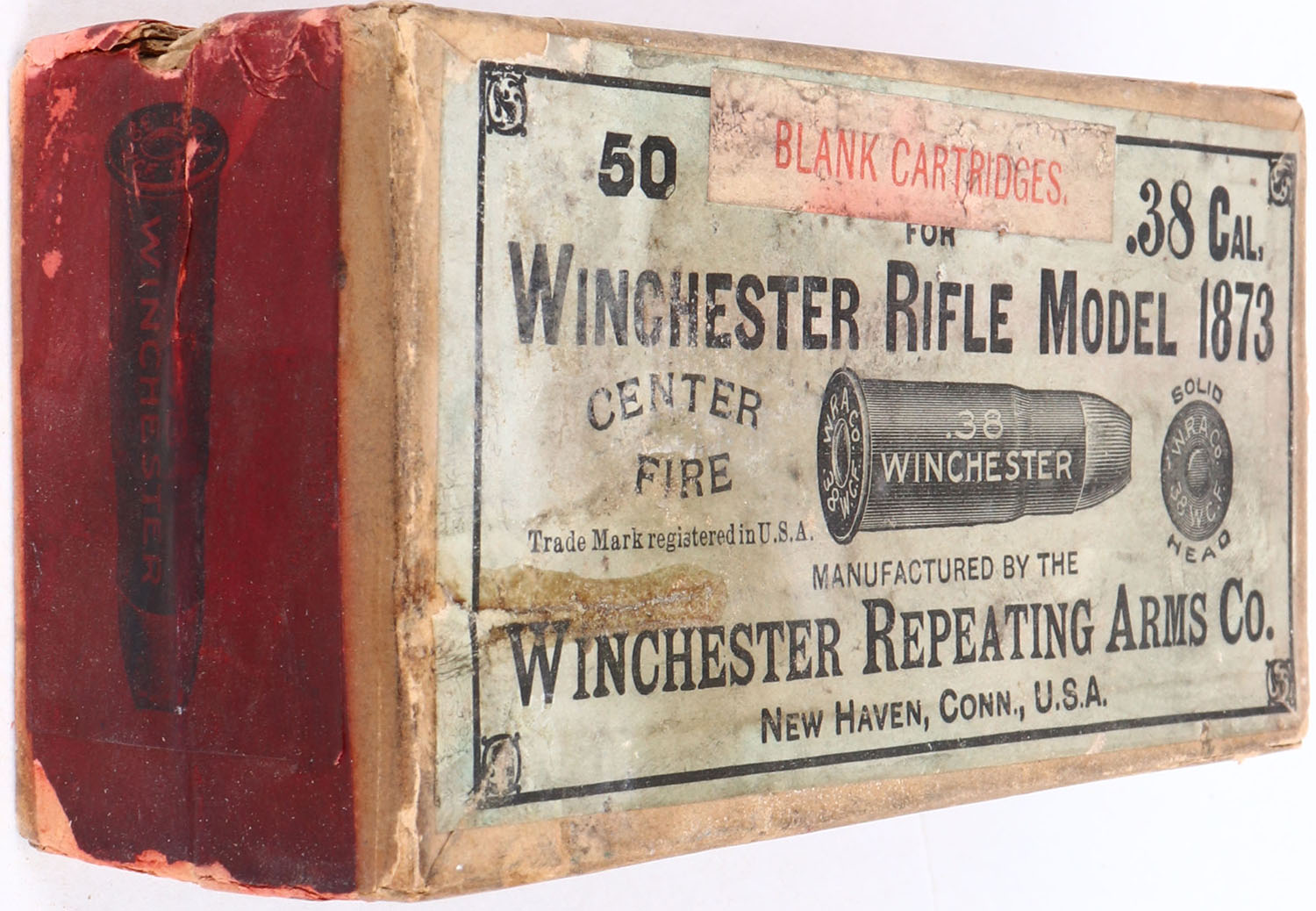 Winchester, .38 Cal. Blank Cartridges, Model 1873, FULL & SEALED, 2pc. Buff box with green top & red side sealing labels, white over-label on top, box is solid with good to very good color, age soiling, color fading to top, corner ding on back left corner, partial seam splits to top right edge and bottom right edge, minor edge & corner wear, bottom is dirty, labels are intact. Grade: Excellent - Value: 50 to 200