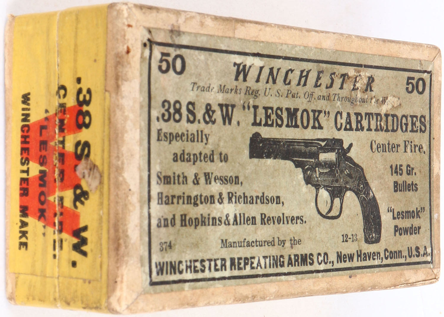 Winchester, .38 S&W Lesmok Cartridges, Full, 2pc. Buff box with green top & yellow side sealing labels, box is solid with very good color, some age soiling, very minor shelf & corner wear, edges are mostly crisp, labels are intact, ammo is very good to excellent. Grade: Excellent + - Value: 50 to 150