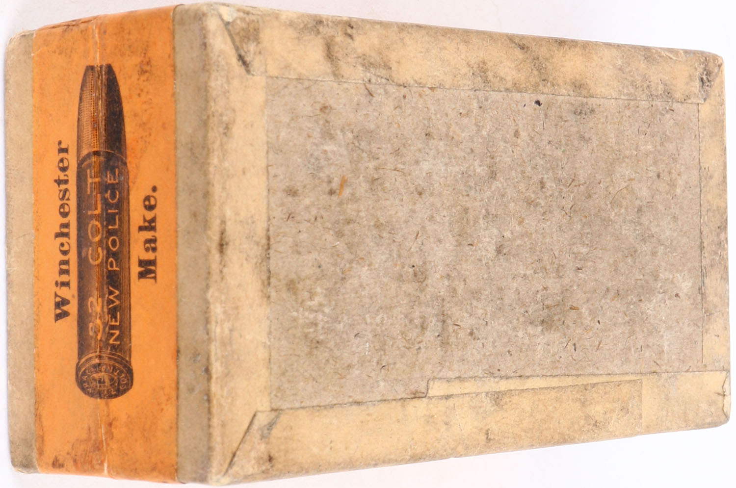 Winchester, .32 Colt New Police, 13 Grains Powder, 100 Grains Grooved Bullet, FULL & SEALED, 2pc. Buff box with green top & orange side sealing labels, box is solid with excellent color, minor age soiling & shelf wear, edges are crisp, corners are sharp, labels are intact. Grade: Excellent ++ - Value: 100 to 300