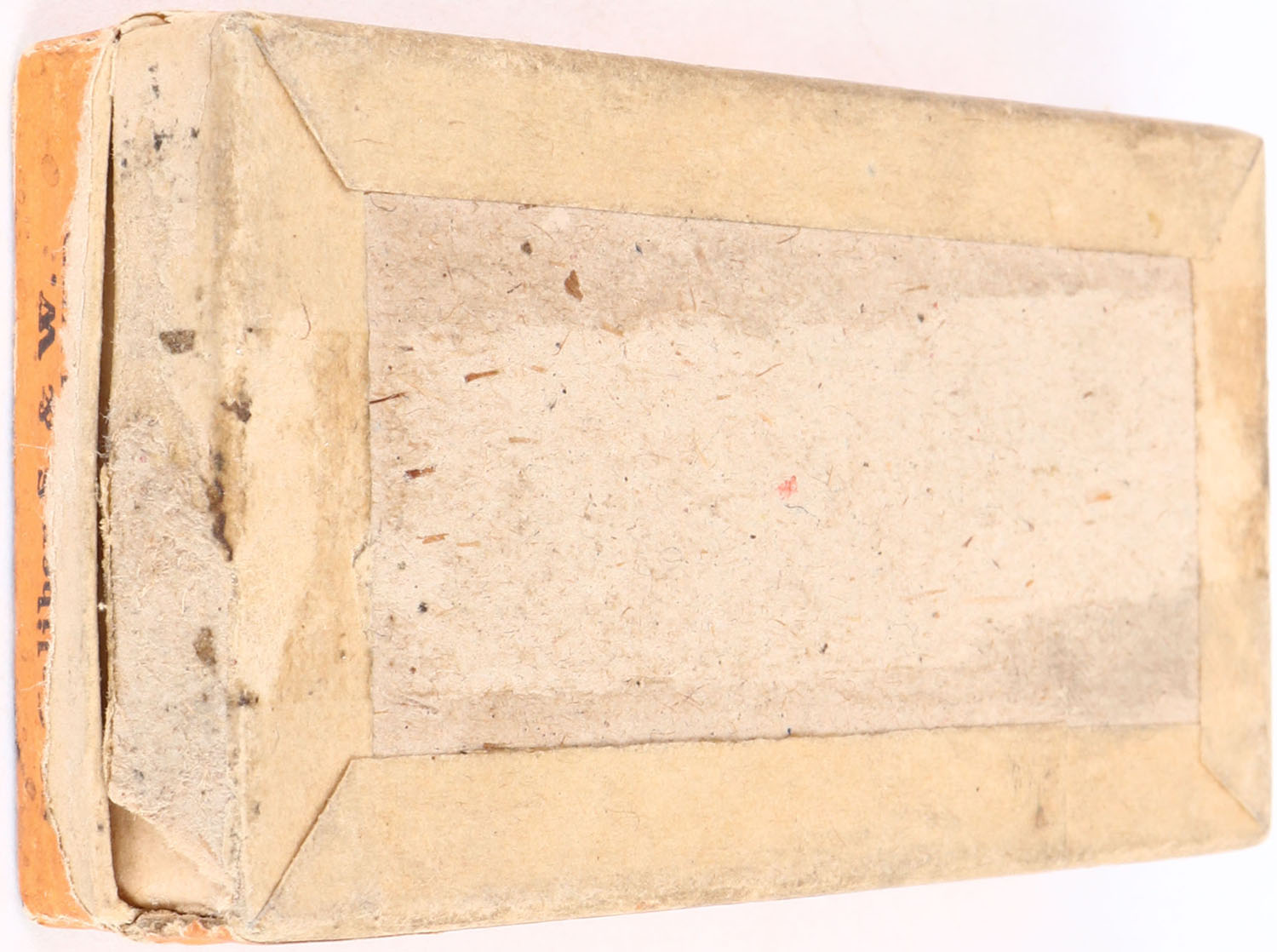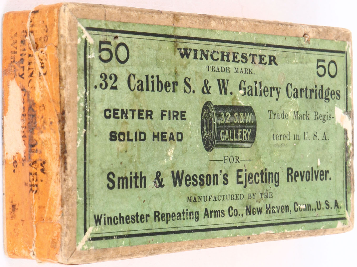 Winchester, .32 Smith & Wesson Gallery Cartridges, Smith & Wesson's Ejecting Revolver, Full & Half-Sealed, 2pc. Buff box with green top & orange side sealing labels, side sealing label is sealed on left end and back side, box is solid with very good color, age soiling, minor shelf wear, minor edge & corner wear, labels are intact, ammo appears very good. Grade: Excellent - Value: 100 to 600