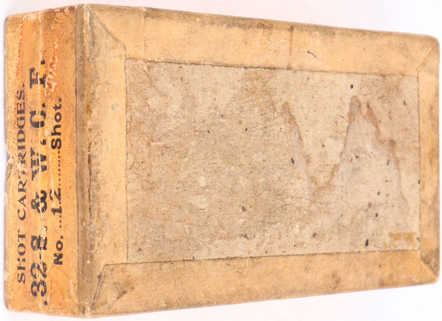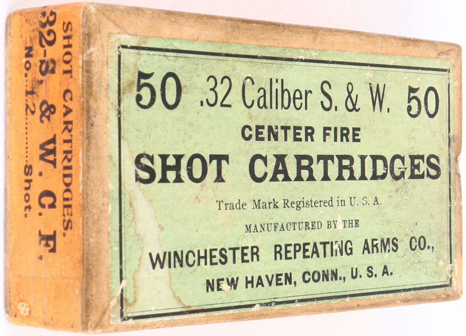 Winchester, ,32 Smith & Wesson Shot Cartridges, FULL & SEALED, 2pc. Buff box with green top & orange side sealing labels, box is solid with excellent color, some age soiling & staining to top & bottom, very minor edge & corner wear, labels are intact. Grade: Excellent + - Value: 150 to 450