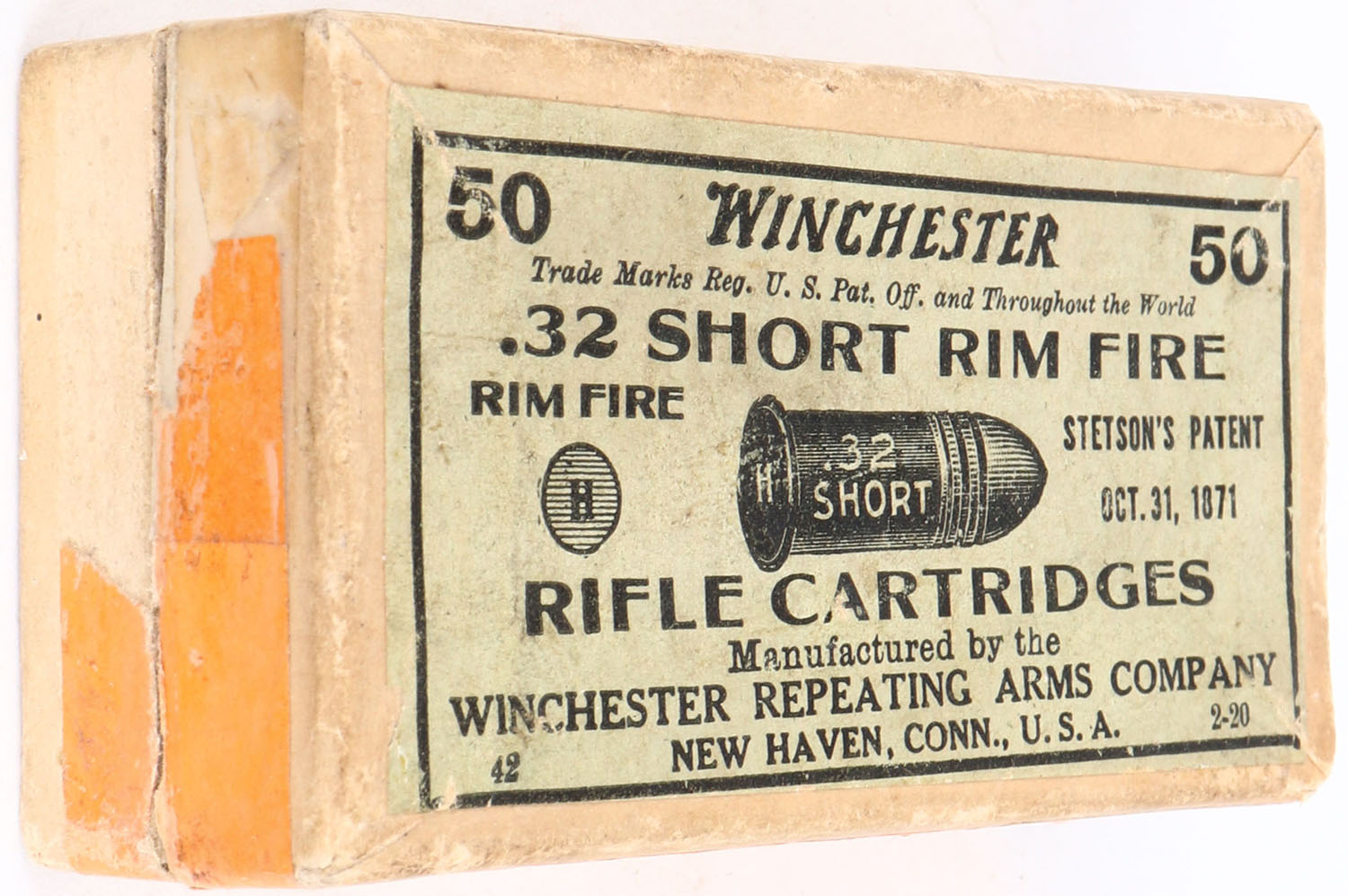 Winchester, .32 Short Rim Fire, Rifle Cartridges, Full, 2pc. Buff box with green top & orange side sealing labels, box is solid with excellent color, very minor age soiling, tape wrapping around 3 of 4 corners of lid, very minor edge & corner wear, side sealing label is 40% intact, ammo is excellent. Grade: Very Good ++ - Value: 30 to 90