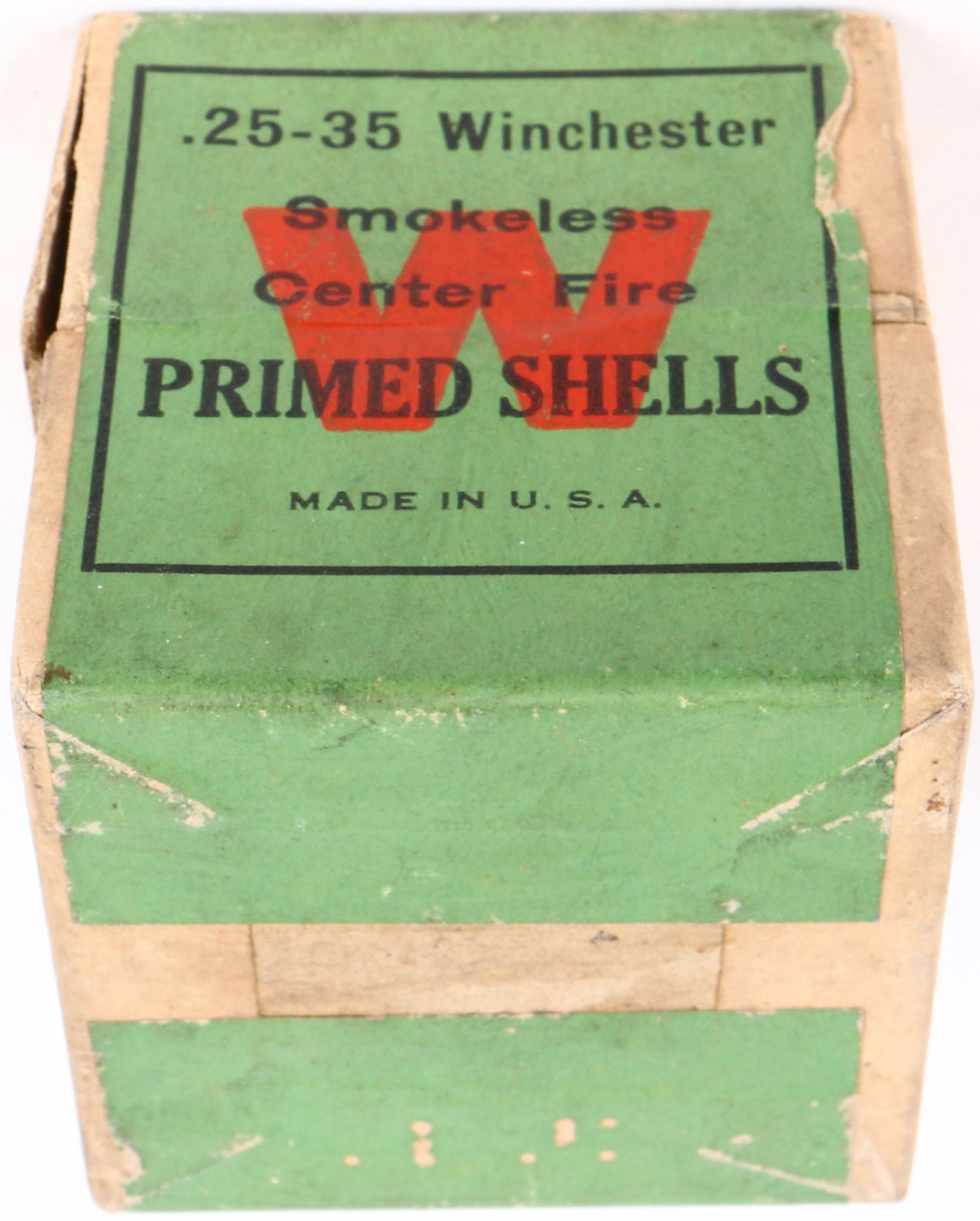 Winchester, .25-35 Unprimed Shells, Smokeless, FULL & SEALED, 2pc. Buff box with green label, box has 3 small seam splits to top label, label has age soiling but is still solid, some age soiling. Grade: Very Good ++ - Value: 40 to 100