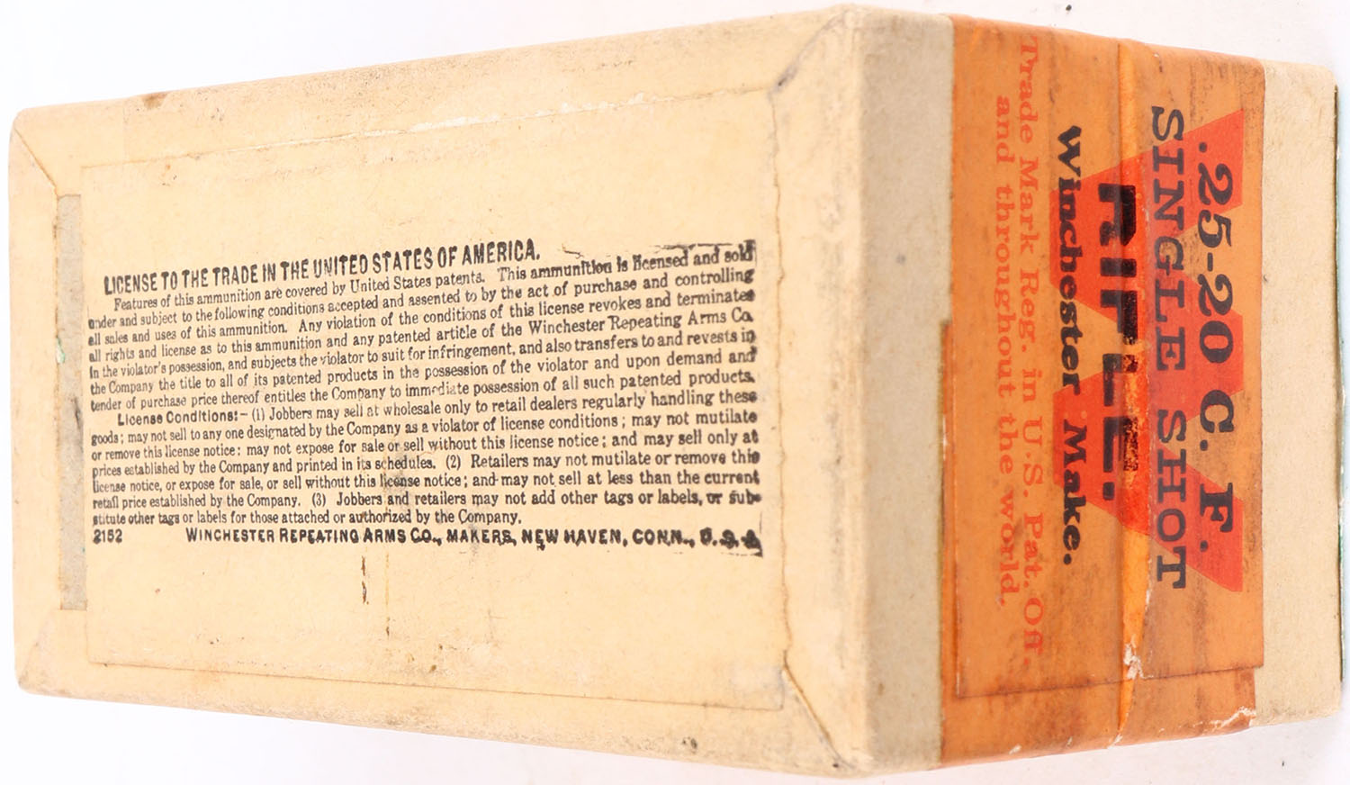 Winchester, .25-20 Caliber Center Fire Single Shot, 86 Grain Bullet, Full & Sealed, 2pc. Buff box with orange and green labels, box is solid, some age soiling to labels. Grade: Excellent - Value: 200 to 500